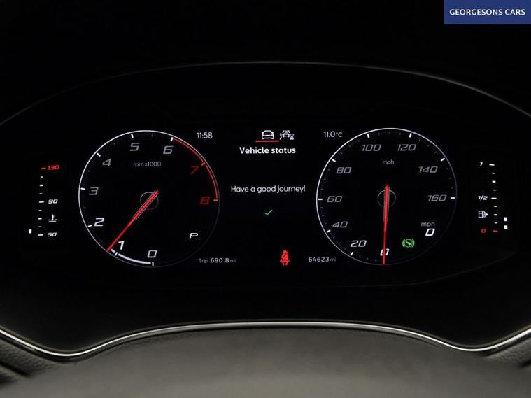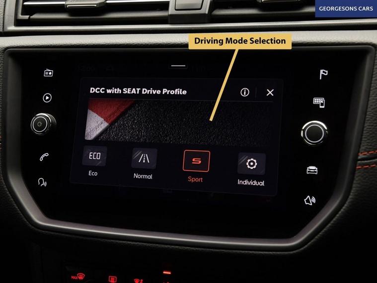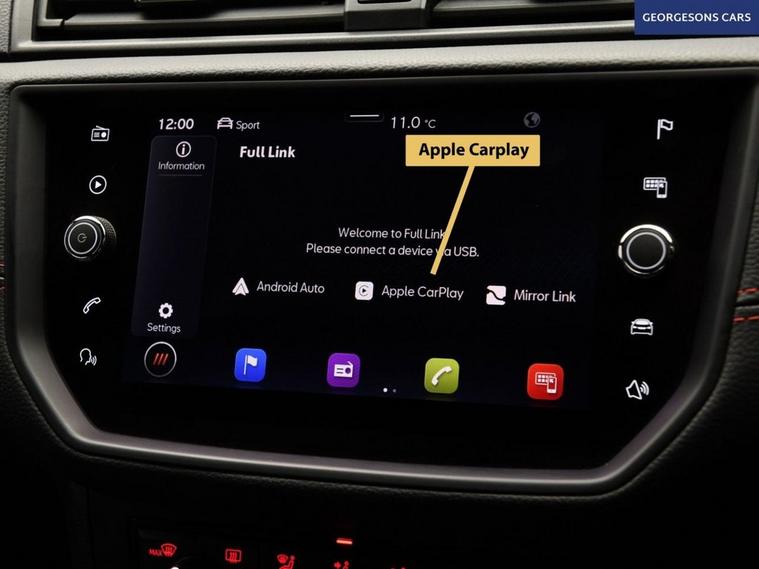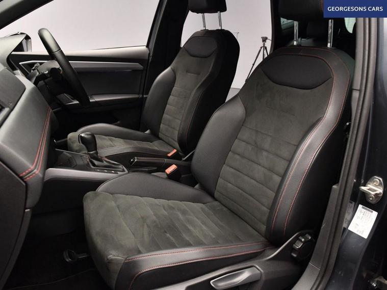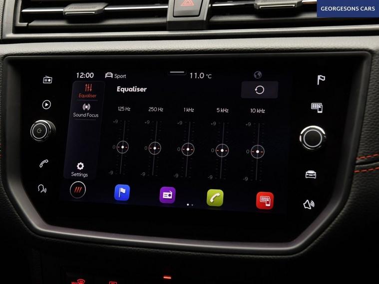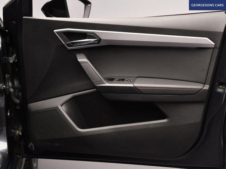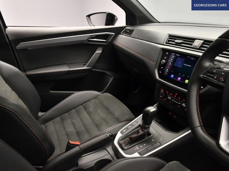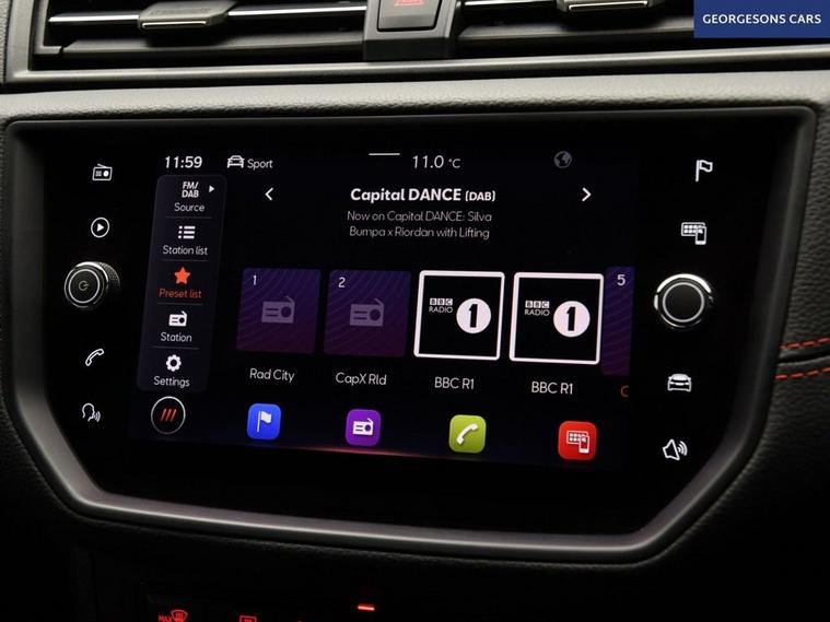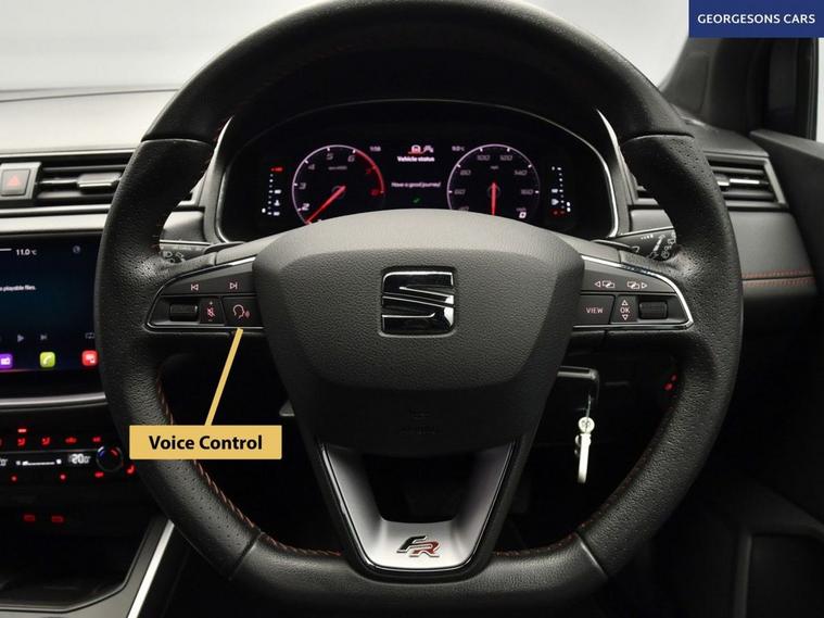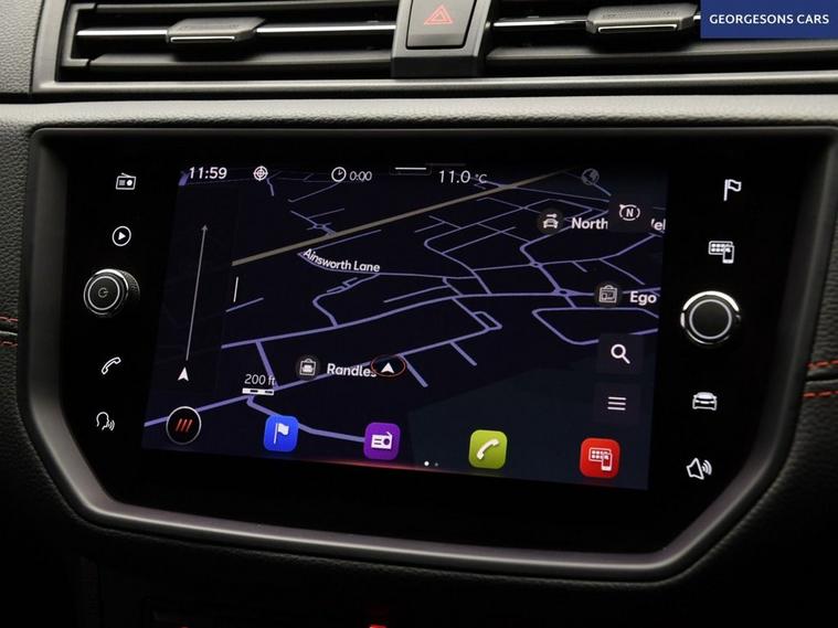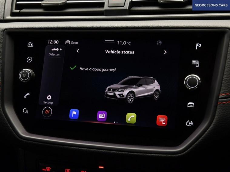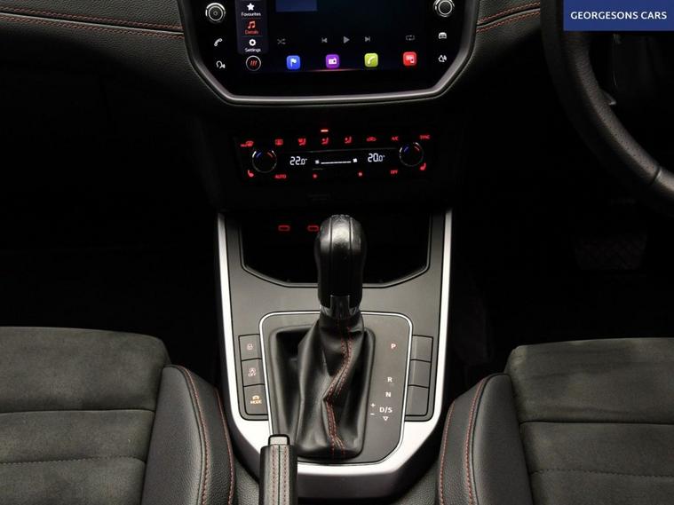 The SEAT Arona 1.5 TSI EVO FR Sport combines a responsive 1.5-litre turbo petrol engine with 150hp, delivering 0-62mph in 8.5 seconds and up to 47.1mpg in this front-wheel-drive setup with a smooth 7-speed DSG automatic transmission. The FR Sport trim brings sporty styling with lowered suspension and a dynamic interior. With four services, this Arona is in excellent condition. Navigate effortlessly with integrated satellite navigation, Apple CarPlay, Bluetooth and DAB radio. Parking is a breeze thanks to the parking sensors. Stay comfortable with dual-zone climate control and the heated windscreen for instant clear vision on cold mornings. Cruise control with speed limiter makes longer journeys relaxed and safe. The practical five-door SUV includes a 400-litre boot for everyday versatility.