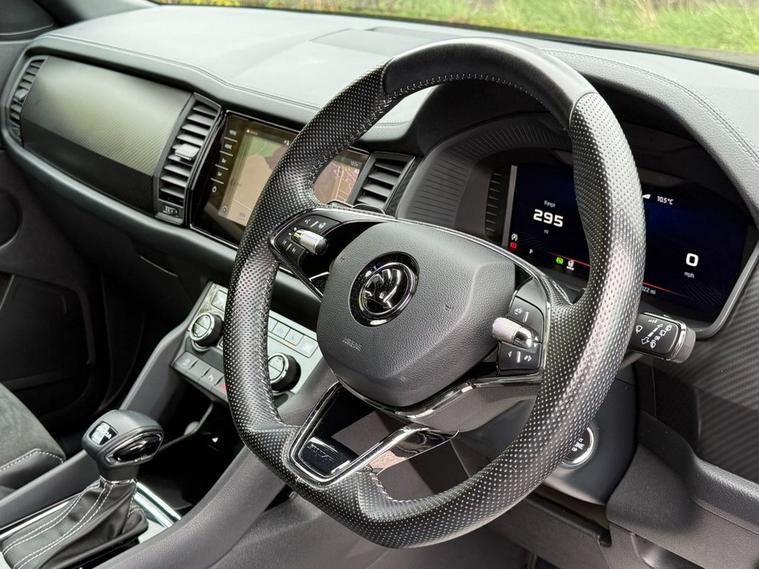 Here for sale at Leigh Cars Ltd we are delighted to present this superb example of a ULEZ EXEMPT 7 Seater Skoda Kodiaq 2.0 TDi Sportline SUV DSG 4 Wheel Drive Automatic 200bhp 5 door finished in grey metallic paint. This vehicle comes with a superb full service history - 4 stamps - last completed in March 2026. The vehicle also comes with a brand new MOT - expiry March 2027. This trim level comes incredibly well equipped with Satellite Navigation, Apple Car Play + Android Auto, Half Black Leather and Suede with Heated Front Seats and Steering Wheel, Cruise Control, Automatic Lights + Wipers, Front + Rear Parking Sensors, Reversing Camera, Wireless Charging, Dual Zone Air Conditioned Climate Control, Bluetooth Connectivity, 7 Seats, DAB radio, Electric Windows + Mirrors, Remote Central Locking, Electric Power Tailgate, Alloy Wheels, 2 keys + much much more. This amazing low mileage petrol automatic example would make an ideal family car and comes with an abundance of practicality and space for all purposes with one of the biggest boots on any car we come across. Save ££££ from new and opt for this low mileage example with great history and VAG build quality at a fraction of the price of its Volkswagen and Audi counterparts. Book in your click & collect or nationwide delivery today to avoid disappointment. As we are an AA accredited dealer you will receive 12 months complimentary AA roadside assistance. AA warranty packages available up to 2 years and superb low rate zero deposit finance deals available today. Why not give us a call or visit our website finance calculator to see how affordable your new car could be. We are rated 5 stars by our customer reviews on Autotrader, Trustpilot, Facebook, Google and Car Gurus so you can be assured you are dealing with a company that truly cares about the customer. We take great pride in providing a personal quality service like no other and guarantee to make your purchase a smooth and pleasant experience. Please read our customer reviews online to see what they have to say about the level of service they received from us when purchasing a car. We have recently been awarded with the accolade of Car Gurus Top Rated Dealer 2023 - thats 6 years running now, as well as Autotrader Highly Rated Dealer 2019, 2020 and 2022 - Buy online in confidence from a multi award winning 5* rated dealer. Click & Collect + Nationwide Delivery available - please call to avoid disappointment.