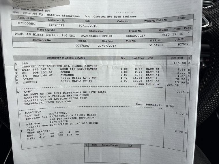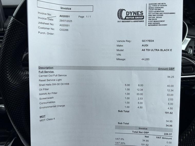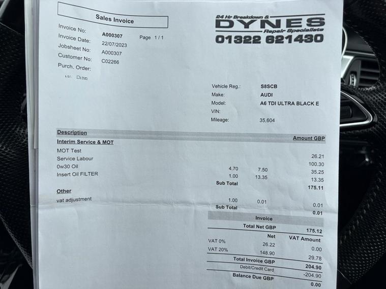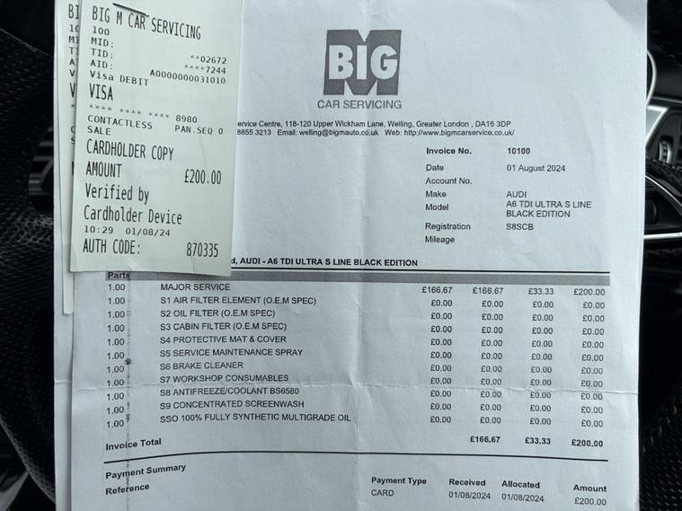 The Audi A6 Saloon, a 2017 TDI Black Edition, boasts a sleek and sophisticated design thats sure to turn heads on the road. This impressive vehicle is powered by a 2.0L Diesel Engine, meeting the stringent Euro 6 emission standards, making it an environmentally friendly choice. With a clear vehicle history check, you can have peace of mind when purchasing this vehicle. The previous owner has taken excellent care of this car, with a remarkably low mileage of 48, 127 miles for its age, and a single owner from new, ensuring a thorough understanding of the vehicles maintenance history. This Black Edition trim comes equipped with a range of premium features, including electrically adjustable front seats with memory function for the drivers side, heated front seats, a BOSE surround sound system, Audi Parking System Plus, and Bluetooth interface. This Audi A6 Saloon is a standout choice in its class, offering exceptional fuel economy of up to 63mpg, making it an economical option for long journeys. Its low CO2 emissions also make it a more environmentally friendly choice. The low mileage and single ownership history demonstrate the previous owners dedication to maintaining this vehicle, ensuring it remains in excellent condition. With its impressive specification and exceptional fuel efficiency, this Audi A6 Saloon is an attractive option for those seeking a reliable and cost-effective vehicle.