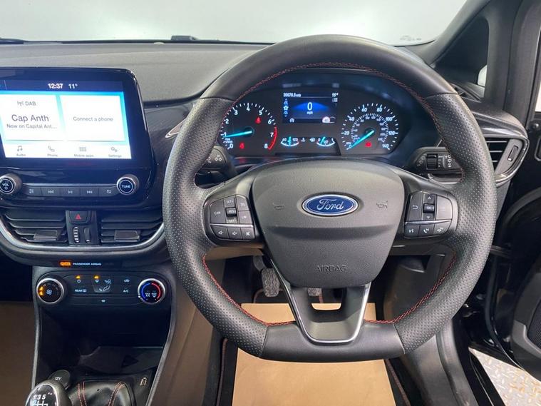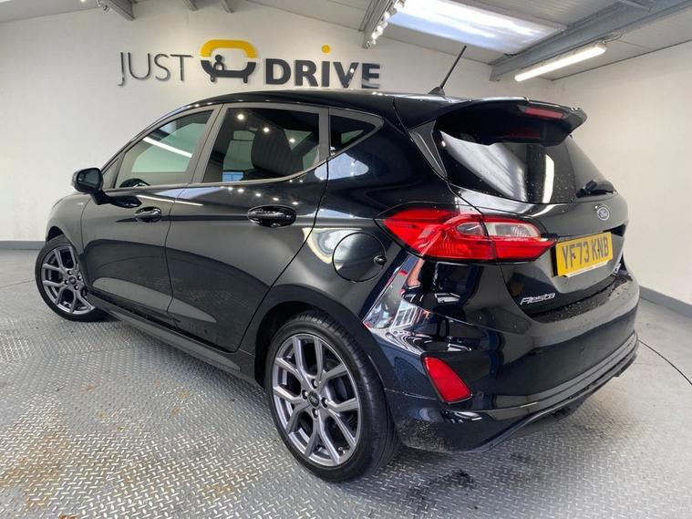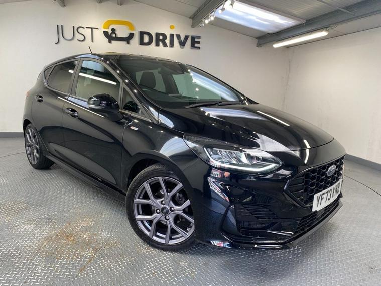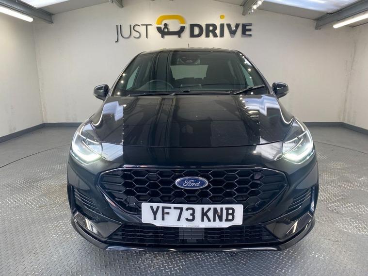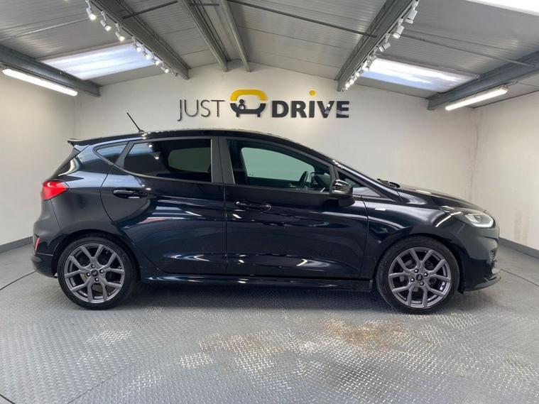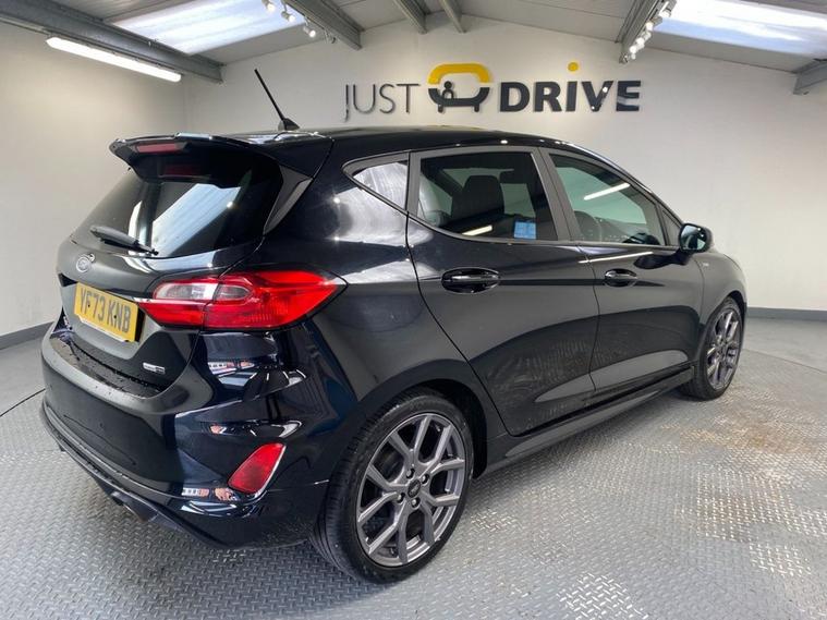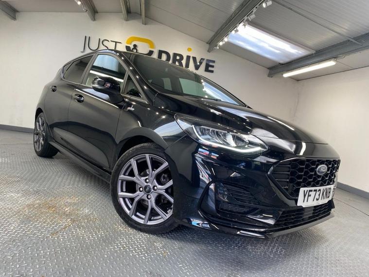 Just Drive are thrilled to offer this fantastic Fiesta ST-Line and its purposeful appearance is backed up by the superb driving experience. Its 1.0 Turbo mild-hybrid petrol engine revs smoothly to deliver peppy performance, while its sports-tuned suspension strikes a nice balance between comfort and dynamism. This is enhanced by its well-weighted, direct steering and a precise, light gearshift. Fully colour coded in Shadow Black the sporty exterior is enhanced with 17 titanium effect alloy wheels, dark tint privacy glass and sports body styling. Inside theres sport style seats in 2-tone cloth upholstery and Fords famous SYNC touchscreen media system - this includes Bluetooth connectivity for multiple devices with voice control and also supports DAB radio. The impressive level of equipment continues with cruise control, rear park sensors, air conditioning, lane departure warning and a leather multi-function sport steering wheel. The 1.0 turbo petrol engine produces a lively 123 Bhp, is ULEZ compliant and should achieve around 57 mpg on the combined cycle.