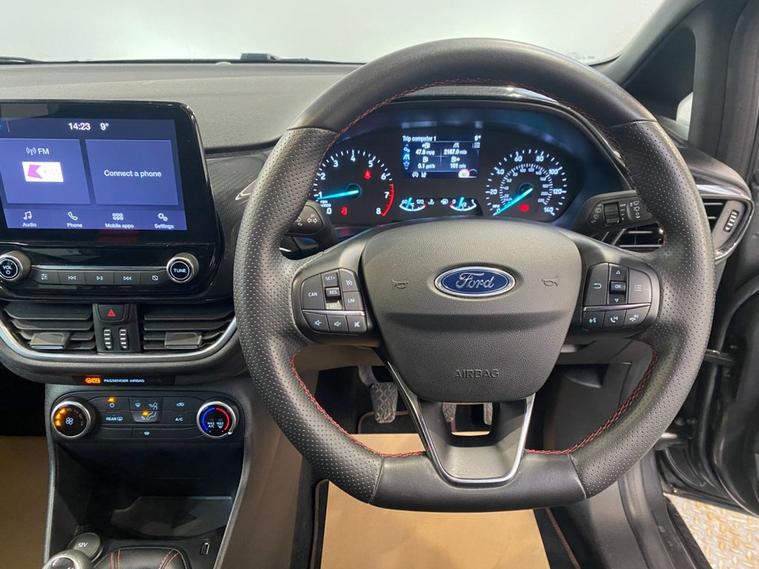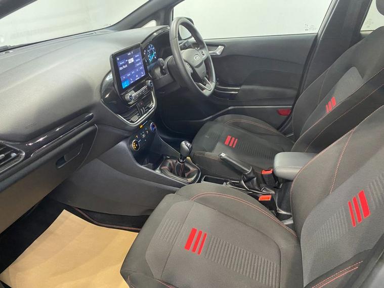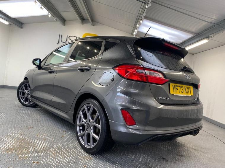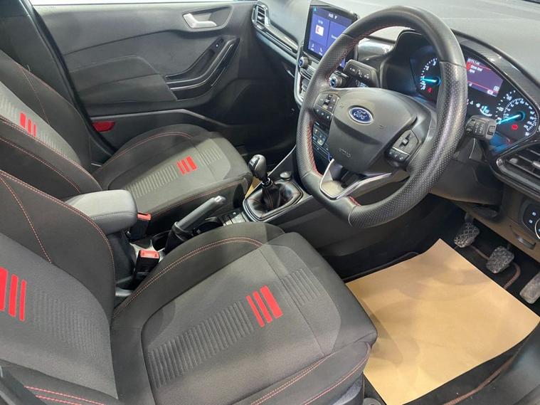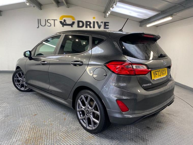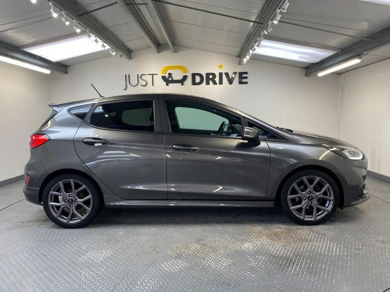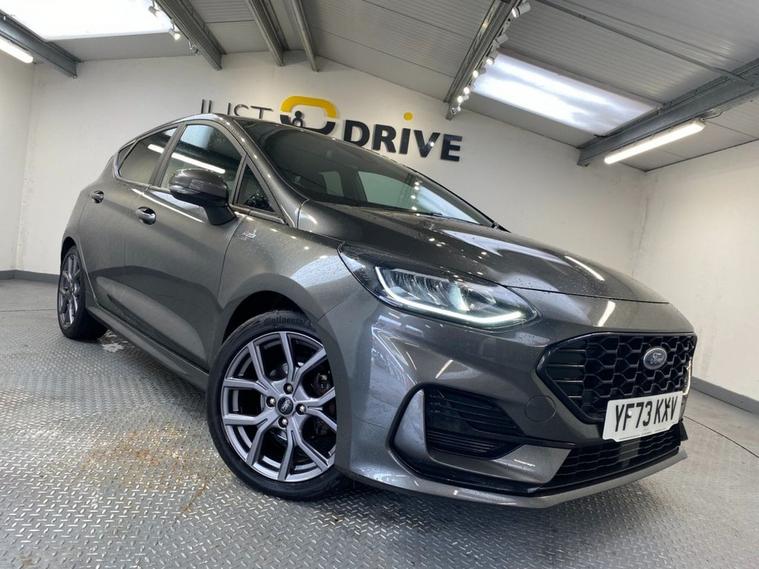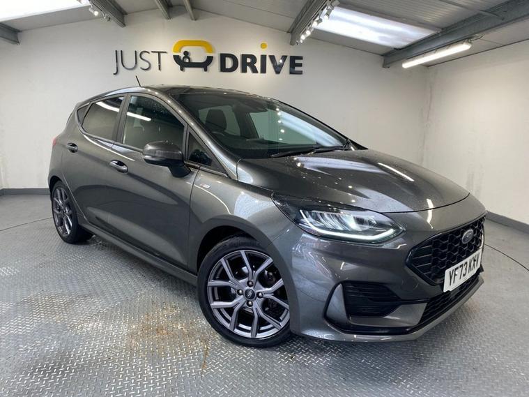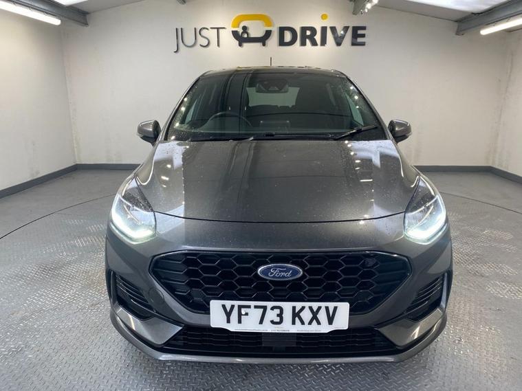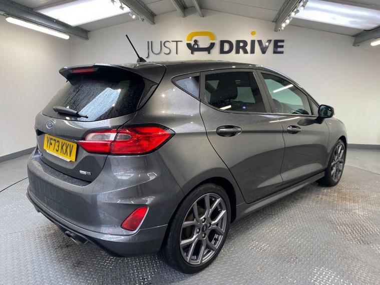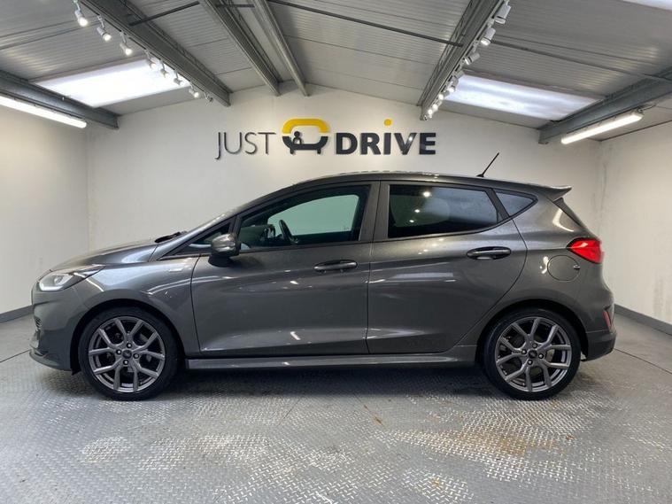 Just Drive are pleased to offer this fantastic Fiesta ST-Line and its purposeful appearance is backed up by the superb driving experience. Its 1.0 Turbo mild-hybrid petrol engine revs smoothly to deliver peppy performance, while its sports-tuned suspension strikes a nice balance between comfort and dynamism. This is enhanced by its well-weighted, direct steering and a precise, light gearshift. Fully colour coded in Magnetic Grey metallic the sporty exterior is enhanced with 17 titanium effect alloy wheels, dark tint privacy glass and sports body styling. Inside theres sport style seats in 2-tone cloth upholstery and Fords famous SYNC touchscreen media system - this includes Bluetooth connectivity for multiple devices with voice control and also supports DAB radio. The impressive level of equipment continues with cruise control, rear park sensors, air conditioning, lane departure warning and a leather multi-function sport steering wheel. The 1.0 turbo petrol engine produces a lively 123 Bhp, is ULEZ compliant and should achieve around 57 mpg on the combined cycle.