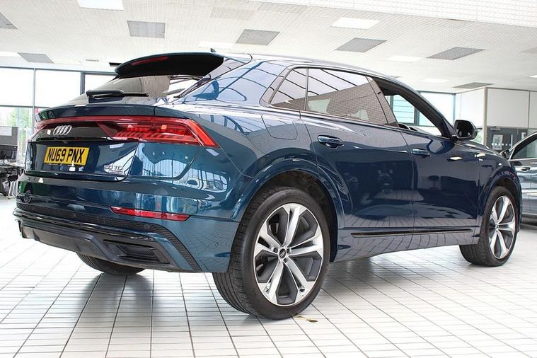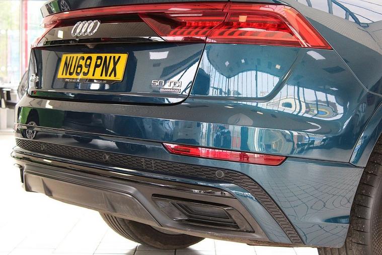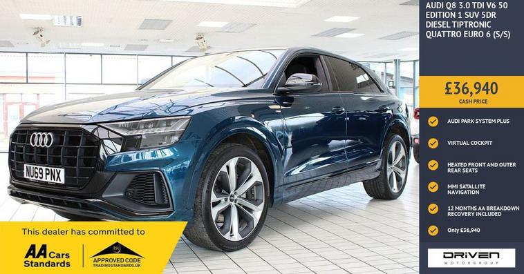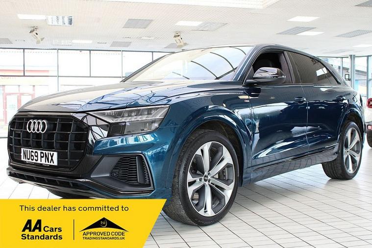 AUDI Q8 3.0 TDI V6 50 EDITION 1 SUV 5DR DIESEL TIPTRONIC QUATTRO FINISHED IN TURQUOISE BLUE AND COMPLIMENTED WITH BLACK LEATHER INTERIOR, THIS VEHICLE HAS BEEN VERY WELL CARED FOR AND MAINTAINED WITH DOCUMENTED SERVICE HISTORY CARRIED OUT 6473, 15004, 21771, 30421, 37016, 45286 MILES PLUS COMPREHENSIVE PRE DELIVERY HEALTH CHECK COMPLETED PRIOR TO SALE AT 49038 MILES. KEY FEATURES INCLUDE 22 INCH ALLOY WHEELS, AUDI MUSIC INTERFACE, ALARM, AUDI CONNECT, AUDI PHONE BOX WITH WIRE;ESS CHARGING, SMARTPHONE INTEGRATION, VIRTUAL COCKPIT, AUTO DIMMING FRAMELESS REAR VIEW MIRROR, CRUISE CONTROL WITH SPEED LIMITER, DAB RADIO, DELUXE FOUR ZONE CLIMATE CONTROL, HEATED ELECTRIC FOLDING AUTO DIMMING DOOR MIRRORS, DOUBLE SUNVISOR, MEMORY FRONT SEATS, MULTIFUNCTIONAL SPORT STEERING WHEEL, HEATED FRONT AND OUTER SEATS, KEYLESS GO, LANE ASSIST, MMI SATALLITE NAVIGATION, PANORAMIC GLASS ROOF, FRONT AND REAR PARKING SENSORS, POWERED TAILGATE, REAR PRIVACY GLASS WITH FITTED BLINDS, REAR VIEW CAMERA, S-LINE STYLING PLUS MUCH MUCH MORE. COMMITTED TO AA CARS STANDARDS: 3 MONTHS OR 3000 MILES WARRANTY INCLUDED WITH AN OPTION TO UPGRADE: 12 MONTHS AA BREAKDOWN RECOVERY INCLUDED: £75.00 CONTRIBUTION TOWARDS YOUR NEXT SERVICE/MOT AT ANY AA CARS STANDARD APPROVED WORKSHOP: WE STAND BY THE QUALITY OF OUR VEHICLES. WITH THE PURCHASE OF THIS VEHICLE, YOU WILL RECEIVE 3 MONTHS OR 3000 WARRANTY, 12 MONTHS AA BREAKDOWN RECOVERY, GIVING YOU ADDITIONAL PEACE OF MIND AND PROTECTION. ALL OUR CARS COME WITH AT LEAST 6 MONTHS MOT AND PRE SALE HEALTH CHECK AND ROAD TEST. OUR PROFESSIONAL TEAM ENSURES YOUR VEHICLE STAYS IN TOP CONDITION, AND YOU ENJOY A HASSLE-FREE OWNERSHIP EXPERIENCE. 4.7 STARS ON GOOGLE WITH OVER 550 REVIEWS: JOIN OUR COMMUNITY OF SATISFIED CUSTOMERS! OUR DEALERSHIP IS PROUD TO HAVE A 4.7 STAR RATING ON GOOGLE, BACKED BY OVER 550 POSITIVE REVIEWS. WE ARE COMMITTED TO PROVIDING EXCELLENT SERVICE AND HIGH-QUALITY VEHICLES. This Vehicle Comes Equipped with High Specification, Which Includes: -