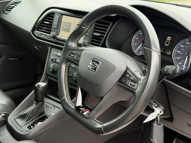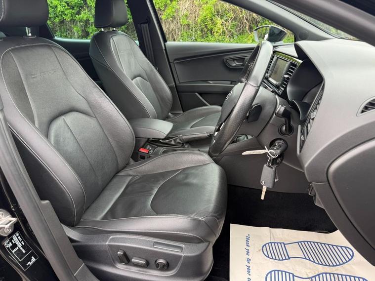 Here for sale at Leigh Cars Ltd we are delighted to present this superb example of the popular Seat Leon 2.0 TSI Cupra 5dr 290bhp petrol automatic finished in metallic midnight black paint. This particular example comes with full service history (9 stamps in total - last completed in February 2026). As part of our thorough pre sale preparations the vehicle also comes fully safety inspected and with a long MOT until October 2026. This car comes with some impressive specification including satellite navigation, heated black leather interior, front + rear parking aid, apple car play and android auto, adaptive cruise control, USB port, climate control air conditioning, bluetooth handsfree, DAB digital radio, voice command, auto lights + wipers, lane assist, steering wheel mounted controls, electric windows + mirrors, power heated mirrors, remote central locking, 2 keys + much much more. This fantastic example only costs £265 a year to tax and returns excellent average fuel consumption of 42.8 mpg, which is ridiculous considering it puts out 290bhp! Its also ULEZ charge exempt being the Euro 6 engine. This full service history great specification Seat Leon Cupra will make a great car. With such great specification along with German built engineered reliability this one will not be with us for long. Book in your appointment, click & collect or nationwide delivery today to avoid any disappointment... As we are an AA accredited dealer you will receive 12 months complimentary AA roadside assistance. AA warranty packages available up to 3 years and superb low rate zero deposit finance deals available today. Why not give us a call or visit our website finance calculator to see how affordable your new car could be. We are rated 5 stars by our customer reviews on Autotrader, Trustpilot, Facebook, Google and Car Gurus so you can be assured you are dealing with a company that truly cares about the customer. We take great pride in providing a personal quality service like no other and guarantee to make your purchase a smooth and pleasant experience. Please read our customer reviews online to see what they have to say about the level of service they received from us when purchasing a car. Click & Collect + Nationwide Delivery available - 14 day money back guarantee subject to T&Cs - please call to avoid disappointment.