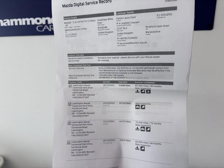 This 2015 Mazda2 SKYACTIV-G Sport Nav boasts a clear vehicle history and has had only two owners, offering you peace of mind. This stylish hatchback is equipped with a 1.5L petrol engine and meets Euro 6 emissions standards. For your convenience, it features Smart Keyless Entry, Climate Control air conditioning, and rear parking sensors. The Sport Nav trim also includes dusk sensing automatic headlights and an integrated Bluetooth system for seamless connectivity on your journeys. Experience impressive efficiency with this Mazda2, achieving an outstanding 63 miles per gallon, which is better than many other vehicles in its class. Its low CO2 emissions further contribute to its economical running costs. Youll also appreciate its responsive performance, accelerating from 0 to 60 mph in just 9.4 seconds, demonstrating a strong balance of efficiency and driving enjoyment. With an MOT valid until October 2026, this Mazda2 is ready for many more miles of reliable motoring.
