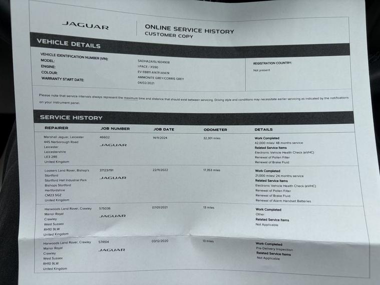 This 2020 Jaguar I-PACE 400 HSE is presented with a clear vehicle history check, offering peace of mind for its next owner. As a fully electric vehicle, it combines sophisticated design with advanced technology. This Four Wheel Drive model boasts a substantial 90 kWh battery, providing a maximum range of 284 miles when new. Charging is convenient, with a full charge at home using a 7kW charger taking approximately 12 hours and 36 minutes, while rapid public charging can replenish the battery from empty to 80% in just 50 minutes. Notable features include a Head Up Display, a Heated Steering Wheel for added comfort, and a 360 Degree Surround Camera system to aid with parking. The I-PACE also features Matrix LED Headlights with Signature Daytime Running Lights and 40-20-40 Folding Heated Rear Seats complete with a centre armrest. The Jaguar I-PACE 400 HSE offers impressive performance, accelerating from 0 to 60 miles per hour in a swift 4.5 seconds, demonstrating its dynamic capabilities. The 284 mile maximum range when new highlights its suitability for both daily commutes and longer journeys, setting it apart from many other electric vehicles. This combination of electric power, all wheel drive capability, and a comprehensive suite of premium features makes this 2020 I-PACE a compelling choice for those seeking a luxurious and capable electric SUV.