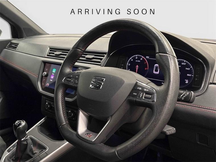 ARRIVING SOON, AVAILABLE TO RESERVE NOW! 2021/21 Seat Arona 1.0 TSi FR Sport [Nav] finished in Midnight Black with Magnetic Grey Roof. We are pleased to offer this lovely 5 door petrol SUV-style hatchback. This is the highly desirable and economical 1.0 litre model with a 6 speed manual transmission that offers 109 BHP and over 50 MPG. Insurance group 13/50. It has covered just 51, 447 miles with service history (details to follow) and drives as you would expect. A brand new MOT and service will be completed with no advisories. We will also include a complimentary 12 month AA breakdown cover. Two owners from new, the last owner has had the car since 2022. Euro 6 status - ULEZ compliant. A superb example with the sought-after FR Sport specification. Highlights include; navigation with high resolution touchscreen display, 18 Performance two-tone diamond cut alloy wheels, DAB, USB, two-tone exterior, bluetooth connectivity with BT audio, digital cockpit, privacy glass, cruise control with speed limiter, full LED headlights with LED DRLs, electric windows x 4, Full Link smartphone integration, heated seats, hill hold control, ambient lighting, rear parking sensors and mulit-function flat bottom steering wheel. The full specification list can be found on our website. Advertised below the AutoTrader RRP. Please let us know if you would like any further information or a detailed video sent via WhatsApp.