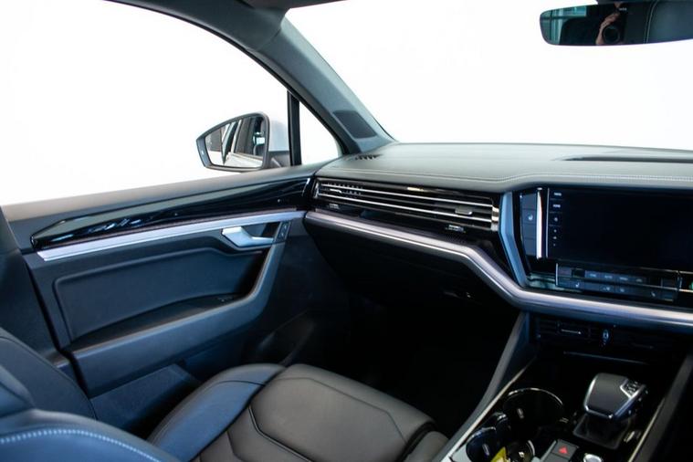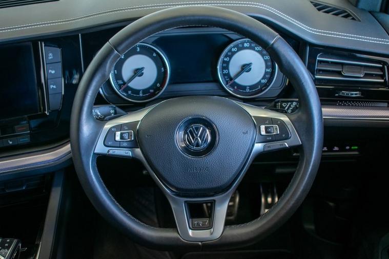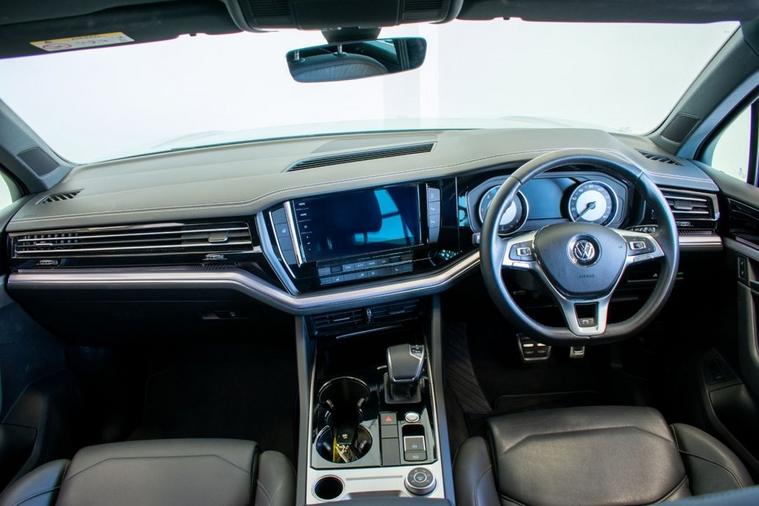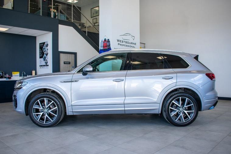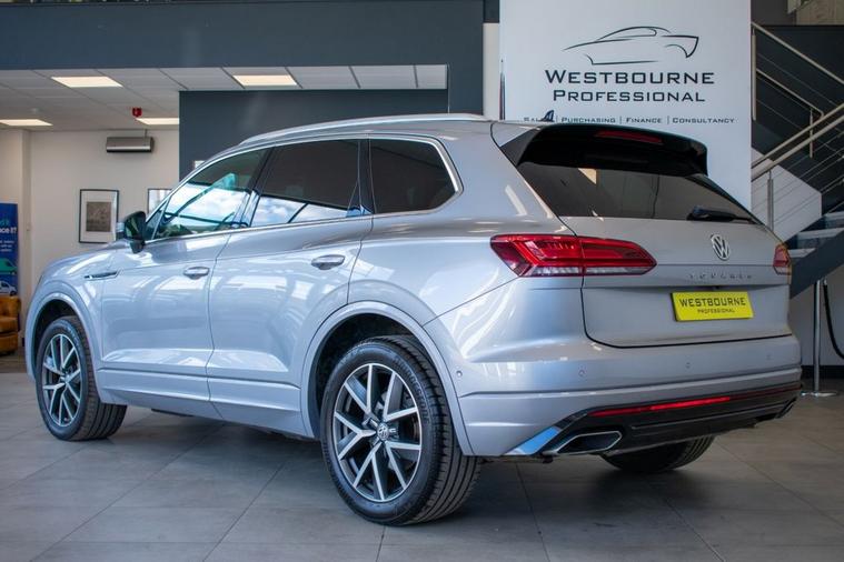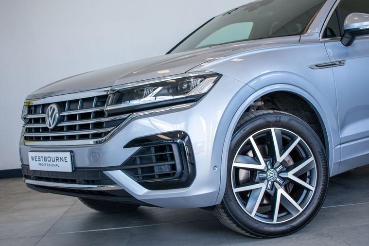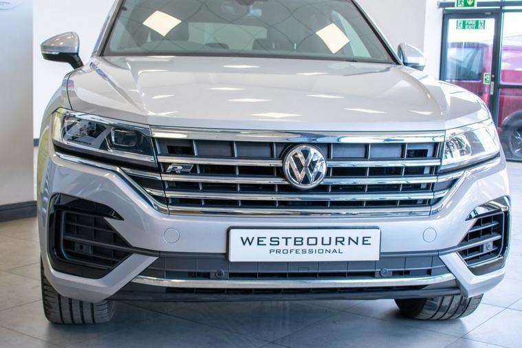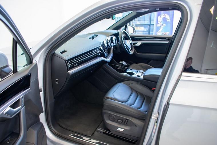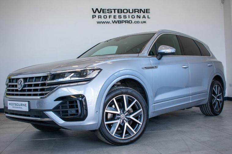 2019 19 Volkswagen Touareg 3.0 V6 TDI R Line, finished in Antimonial Silver with Black Vienna Leather interior. Equipped with full R Line specification including 20-inch Braga Alloy Wheels, Discover Satellite Navigation Pro, App Connect, Park Assist, Front & Rear Parking Sensors, Rear View Camera, Adaptive Cruise Control, Power Tailgate, Heated Front Seats, Heated Multifunction Steering Wheel with Paddle Shift, Automatic LED Headlights, Automatic Dual Zone Climate Control, DAB Radio, Bluetooth Telephone & Audio Connectivity, Keyless Start, Rear Privacy Glass and much more. Supplied with full service history carried out at 11905, 24203, 33663, 43036 and 51139 miles.