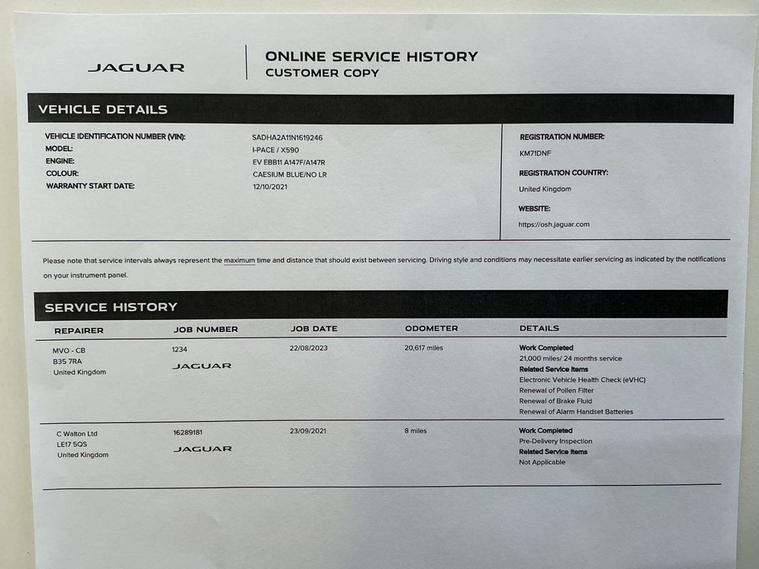 This 2021 Jaguar I PACE 400 HSE is an electric vehicle offering an impressive 280 miles of range from its 90 kWh battery. This Four Wheel Drive model combines sophisticated design with advanced technology, featuring a heated steering wheel for added comfort, adaptive cruise control with steering assist for a more relaxed driving experience, and 40 20 40 folding heated rear seats with a centre armrest. Stay connected on the go with Bluetooth connectivity and enjoy a perfectly controlled cabin environment thanks to the 2 zone climate control. Experience exhilarating performance with the I PACE 400 HSE, capable of accelerating from 0 to 60mph in just 4.5 seconds, a figure that highlights its superior performance compared to other vehicles in its class. When it comes to charging, a full charge at home using a 7kW charger takes approximately 12 hours and 36 minutes, while rapid public charging can replenish the battery from empty to 80% in as little as 50 minutes, ensuring you can get back on the road quickly.