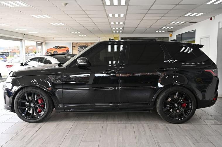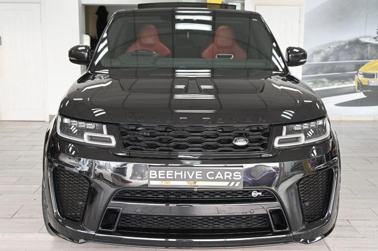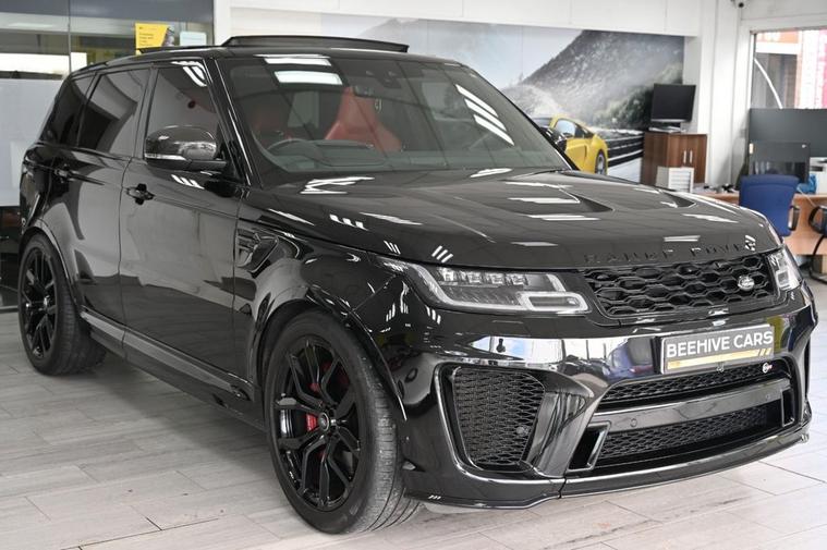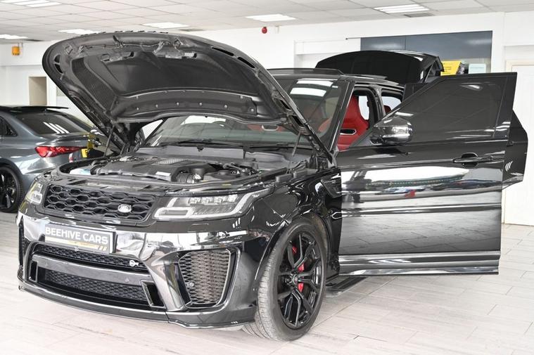DRIVE AWAY TODAY OR HOME DELIVERY TO YOUR DOORSTEP FINANCE & PART EXCHANGE ARRANGED ONLINE** 7 DAY MONEY BACK GUARANTEE** *Nice 4x4 Range Rover Sport 5.0 p575 v8 svr 4wd in metallic black with service history head up display reverse camera panoramic glass roof sat nav cd dab radio bluetooth media usb merifian surround sound soft closure door red and black leather seats with armrest heated seats electric seat electric folding door mirrors front and rear parking aid sensors xenon lights heated steering wheel with f1 style paddleshifts push button start stop electric push button tailgate deployable side step bars alloys privacy thatchman approved immobiliser