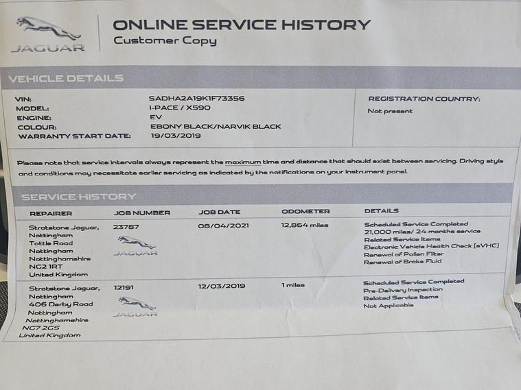 This 2019 Jaguar I-PACE 400 SE boasts an exceptionally low mileage of just 40, 869 miles, a clear vehicle history check, and an MOT valid until January 2027, offering peace of mind for its next owner. This all electric, Four Wheel Drive model features a substantial 90 kWh battery, providing a maximum range of 292 miles when new. Inside, youll find a luxurious cabin equipped with a Meridian Sound System, 10-way electric memory front seats, and Premium LED Headlights with Signature DRL. Stay connected and in control with Bluetooth Connectivity and the Drive Pack, which includes Adaptive Cruise Control and Blind Spot Assistance. Experience exhilarating performance with the I-PACEs impressive 0-60mph acceleration in just 4.5 seconds, a testament to its electric power. Charging is convenient, with a full charge taking approximately 12 hours and 36 minutes at home using a 7kW charger, and a rapid charge to 80% achievable in just 50 minutes at a public charging station. These capabilities, combined with its impressive range and advanced features, set this Jaguar I-PACE apart from other electric vehicles.