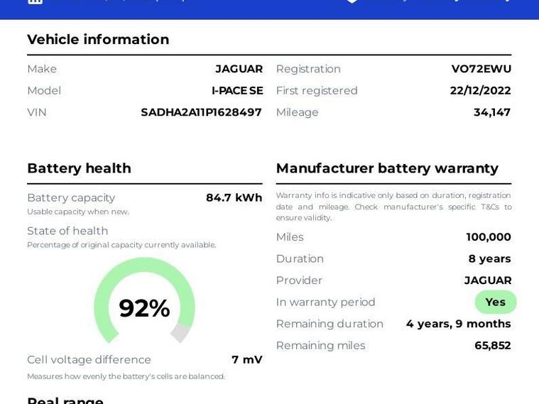 GRADE A BATTERY HEALTH This 2022 Jaguar I PACE 400 SE is a superb example, having had only one owner from new and boasting a clear vehicle history check. As a fully electric vehicle, it offers a smooth and quiet driving experience, powered by a 90 kWh battery that provides a maximum range of 279 miles when new. This Four Wheel Drive model, in SE trim, combines Jaguars renowned luxury with cutting edge electric technology, making it an exceptional choice for those seeking a premium and sustainable drive. The I PACE 400 SE truly excels with its performance figures, achieving 0-60mph in a rapid 4.5 seconds, demonstrating its potent acceleration capabilities which set it apart from many other electric vehicles. Charging is convenient, with a full charge taking approximately 12 hours and 36 minutes on a standard 7kW home charger, while rapid public charging can replenish the battery from empty to 80% in as little as 50 minutes, ensuring you can get back on the road quickly. Service History 28/10/24 @ 21255 miles by Jaguar Nuneaton car sales will health check this vehicle Key Features & Specification Alloy Wheels LED Daytime Running Lights [Parking sensors / camera] Cruise Control Air Conditioning / Dual-Zone Climate Control Satellite Navigation DAB Digital Radio Bluetooth Connectivity USB / Voice Control ISOFIX Child Seat Mounts Driver Assistance Features Start/Stop Technology Memory drivers seat Heated front seats Meridian sound system Electric folding mirrors Sport driving mode Apple car play and android auto Why Buy From Nuneaton Car Sales? Multi Award-Winning Dealership AA Approved Dealer NO ADMIN FEES 12 Months AA Breakdown Cover Multi-Point Vehicle Inspection Free MOT if due within 6 months Competitive Finance Available Part Exchange Welcome Click & Collect & Home Delivery Available Same Day Drive Away on most vehicles Extra Peace of Mind Personalised walk-around videos available on request. All vehicles professionally prepared and valeted prior to sale. This vehicle is price-checked daily against the UK market to ensure excellent value. Every effort is made to ensure vehicle information is accurate. Specification data may be supplied by a third-party source. If a particular feature is important to your purchase decision, please contact our sales team who will be happy to confirm.