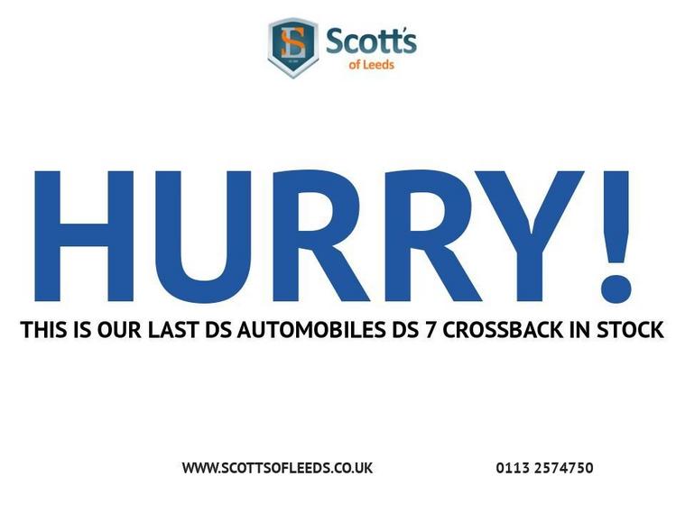 Scotts of Leeds used Car Sales are pleased to offer this DS 7 CROSSBACK 1.5 BlueHDi Performance Line Crossback 5 Door Diesel Manual in Grey. The car is in good condition throughout, in a lovely colour combination and a great specification including Satellite navigation, Apple car play, Bluetooth, DAB digital radio, Cruise control, Parking sensors, Automatic lights & wipers, Lane departure warning, Voice command, USB point, Privacy glass, Electric windows, Drivers armrest, 6 speed gearbox, Isofix, Alloy wheels and much much more. The car will be supplied with an up to date service record including 5 services having just been serviced in our Workshop, an MOT until March 2027 and 2 Keys ready to drive away. 3 MONTH NATIONWIDE WARRANTY provided with all vehicles. NATIONWIDE DELIVERY also available. A guaranteed 12 Months MOT can be added for an extra £100. DISCLAIMER: The above specification is true and correct. Any other specification listed elsewhere can sometimes be incorrect. Please check with Sales Executive to clarify this if needed prior to purchase.