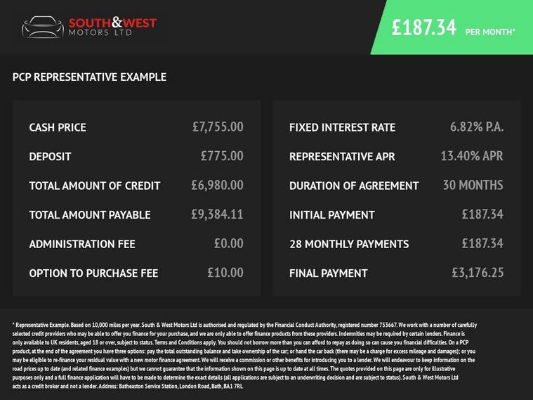 *The representative example includes an estimated option to purchase fee of £10. This is subject to status and although fees may vary in amount and when payable, the total cost of credit and APR received will not alter. This representative example is for illustration purposes only and does not constitute an offer. Written quotations are available on request and finance is subject to status.Borrowing £19,000.00 at a representative APR of 11.9%, annual interest rate (fixed) 11.9%, deposit of £0, 48 monthly payments of £359.86, optional final payment £8,150 (inc. £10 option to purchase fee), total cost of credit is £6,423.28†, total amount of credit is £19,000.00, total amount payable is £25,423.28.