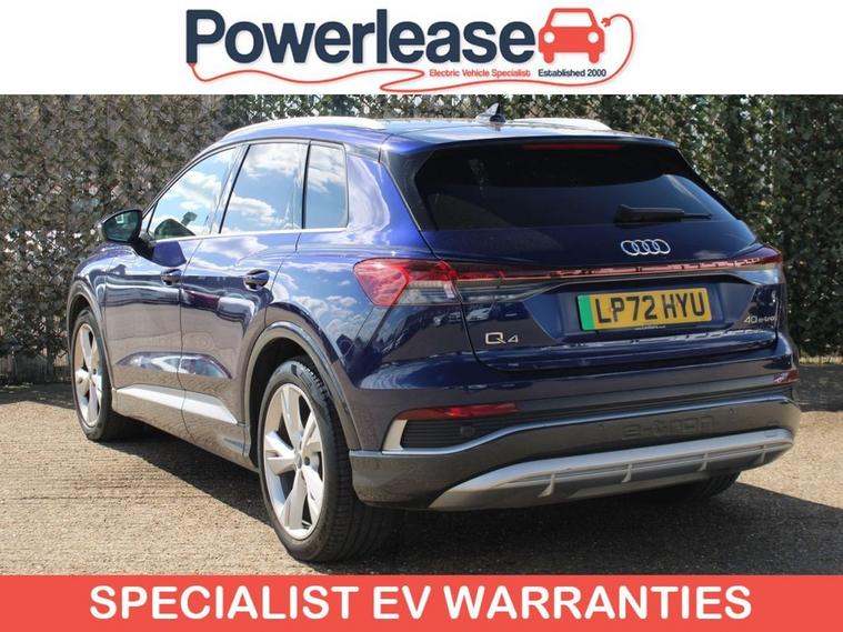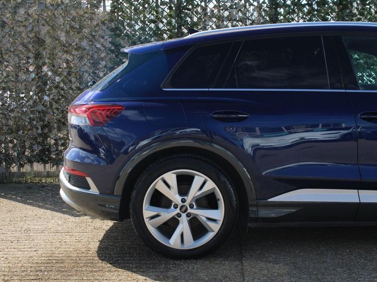 This 2022 Audi Q4 e-tron S line boasts exceptionally low mileage for its age, having covered just 22, 287 miles. As an electric vehicle, it offers a smooth and quiet driving experience, powered by an 82 kWh battery that provided a maximum range of 312 miles when new. This S line variant benefits from the sporty S line trim, enhancing its already stylish appearance. The Audi Q4 e-tron is designed for modern living, featuring a large boot space perfect for luggage, shopping, or sports equipment. Recharging is convenient, with a full charge at home using a 7kW charger taking approximately 11 hours and 30 minutes, ideal for overnight top ups. For longer journeys, rapid public charging can replenish the battery from empty to 80% in as little as 30 minutes, demonstrating its practicality for everyday use and travel.