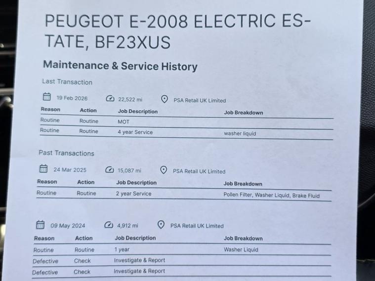 This 2023 Peugeot E-2008 GT is a superb example, having had only one owner from new and boasting a clear vehicle history check. As an electric vehicle, it offers a 50 kWh battery with a maximum range of 214 miles when new, making it ideal for both daily commutes and longer journeys. Charging is convenient, with a full charge at home taking approximately 7 hours and 30 minutes using a 7kW charger, and rapid public charging can take it from empty to 80% in just 30 minutes. The MOT is valid until March 2027, providing peace of mind for the next owner. This GT trim level comes equipped with a host of desirable features that enhance the driving experience. Stay connected with the Bluetooth Telephone Facility and enjoy effortless smartphone integration thanks to the Wireless Phone Charging plate. The Visibility Pack ensures excellent illumination with automatic headlights, while the Automatic Air Conditioning with pollen and carbon filters provides a comfortable cabin environment. Parking is made simpler with rear parking sensors. These features, combined with its electric powertrain and single owner provenance, set this Peugeot E-2008 GT apart from other vehicles in its class.