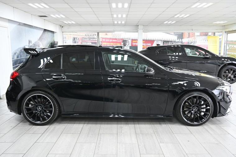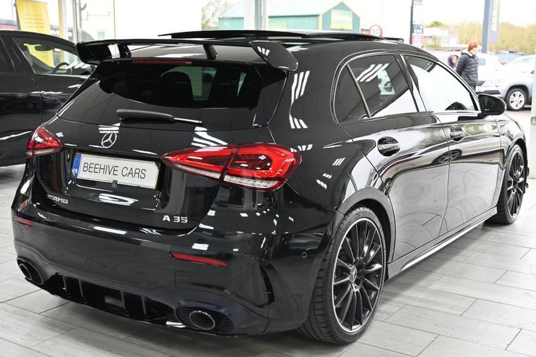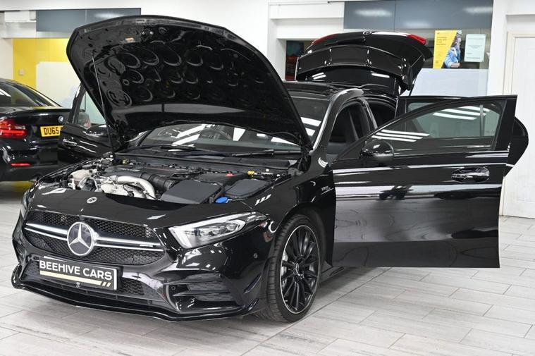 DRIVE AWAY TODAY OR HOME DELIVERY TO YOUR DOORSTEP FINANCE & PART EXCHANGE ARRANGED ONLINE** 7 DAY MONEY BACK GUARANTEE** Lovely Mercedes A-Class A35 amg premium plus 7g-dct 4matic in metallic cosmo black with full. mercedes service history sat nav dab radio bluetooth media usb reverse camera panoramic glass roof leather seats with armrest heated seats electric memory seats electric folding door mirrors front and rear parking aid sensors xenon lights flat bottom amg steering wheel with f1 style paddleshifts comfort sport slippery individual dynamic driving modes push button start stop amg bodystyling kit alloys privacy