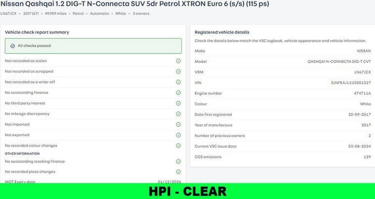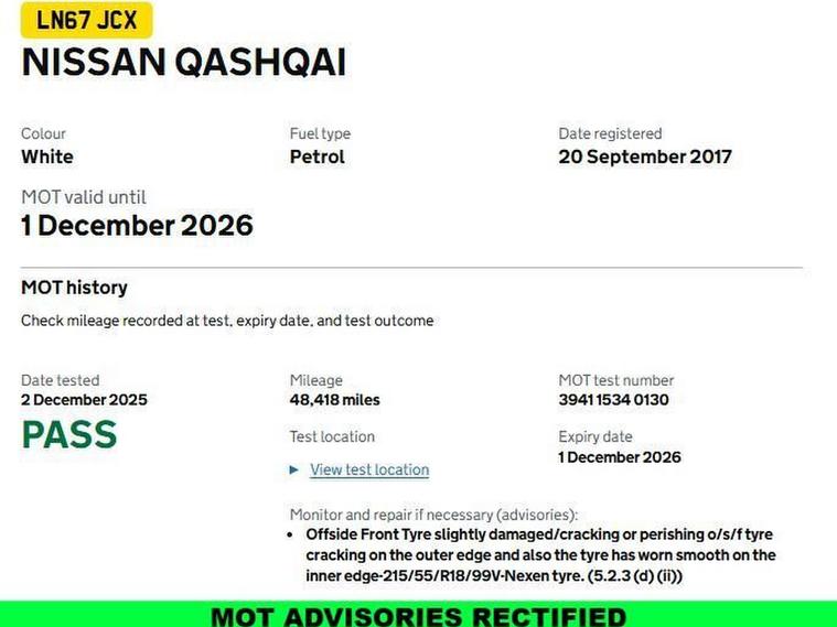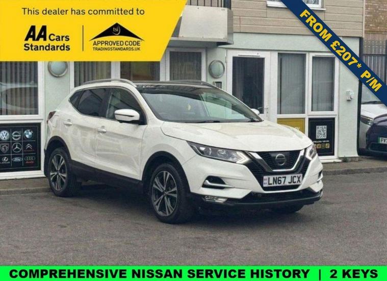 Visits by appointment please book in advance. Comprehensive NISSAN Service History | 6 Services - All by NISSAN | Set of 2 Keys | Low Insurance Group: 14/50 | Panoramic Glass Sunroof | Rear & Sideview Camera with F & R Parking Sensors | Smart Keyless Entry (Comfort Access) | ULEZ Exempt | 6 Months Warranty with an optional upgrade to 12 and 24 Months | Finance Available from 4.63% (Fixed Rate) 8.9% Apr - Decision within 30 mins | Free 12 Months AA Basic Breakdown Cover | Part Exchange Welcome | Last Service Carried out on 05/11/2025 at 48, 394 Miles by NISSAN | MOT Valid Till 01/12/2026 | Automatic Folding Wing Mirrors | Navigation System with Maps & Traffic Updates | Fully Adjustable Front Seat(s) | Front Collision Assist | Traffic Sign Assist | Automatic Dual-Zone Climate Control with Air Conditioning | Cruise Control | Auto Start/Stop | Emergency Brake Assist | Auto Dimming Rear View Mirror | Automatic Headlights & Wipers | Electric Parking Brake | Automatic Gearbox | AUX/USB/Bluetooth/SD/CD Media Connectivity | Traction Control | Handsfree Connectivity | Voice Control | DAB Digital Radio | Daytime Running Lights | Rear Privacy Glass | Front & Rear Heated Windscreens | Roof Rails - White | Tyre Pressure Monitoring System | Multi-Functional Steering Wheel Controls | Full Electric Windows | Front & Rear Fog Light(s) | Rear Folding Seat(s) | Multi Trip Info | Central Locking | Window Lock | ISO Fix | Front Passenger Airbag Control | Child Lock | 18 Alloys | Only 3 Owners From Brand New | Tyre Inflator Kit - Present. An excellent example of a Well Maintained Car. Competitive finance packages available, call now for a free no obligation quote! Nationwide delivery service available. Full walk around video available upon request. Part exchange is welcome, please call for a free valuation. Please read our 5 star reviews to ensure you are buying with confidence from a dealership that has been serving the country for years. Open 7 days a week. All External Finance Providers are Subject to a Finders Fee. There is no finders Fee for our in-house finance providers.