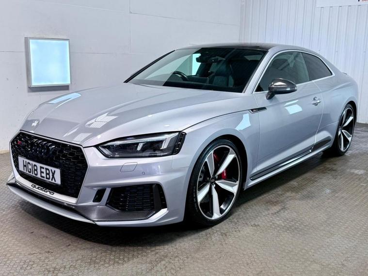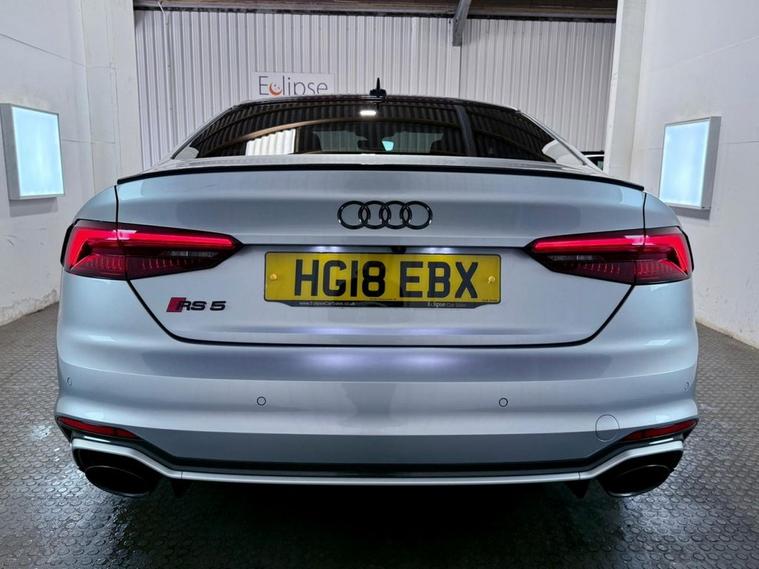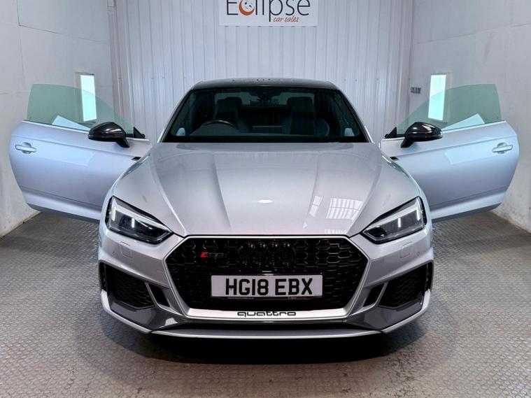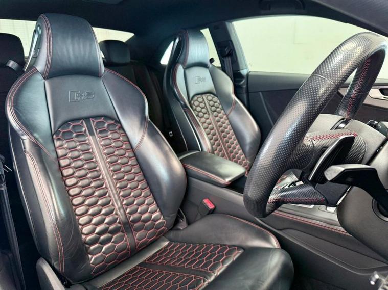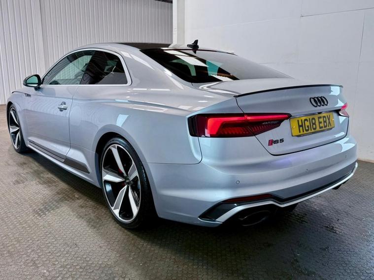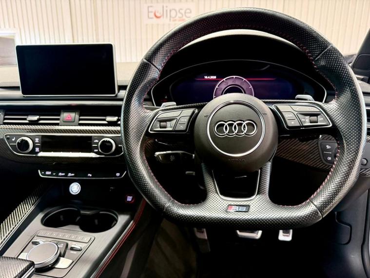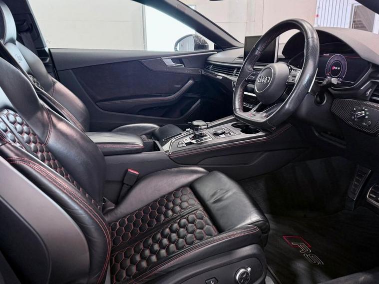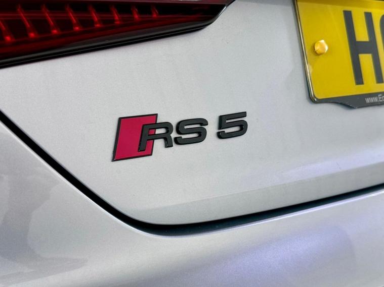 Audi RS5 2.9 V6 TFSI Carbon Edition Coupe First Registered June 2018. Finished in Floret Silver with Black Nappa Leather Super Sport Seats and Contrast Crescendo Red Stitching. Specification Includes Electric Memory Heated and Massage Leather Seats | Reverse Camera with Front and Rear Parking Sensors | Advance Key | 3 Zone Climate Control | Bang & Olufsen 3D Sound System | DAB Radio | Multifunction Steering Wheel | Cruise Control | Heated and Folding Door Mirrors. Serviced by Audi at 18215 | 34725 | 49277 | Fresh Service by Ourselves Before the Car Leaves.