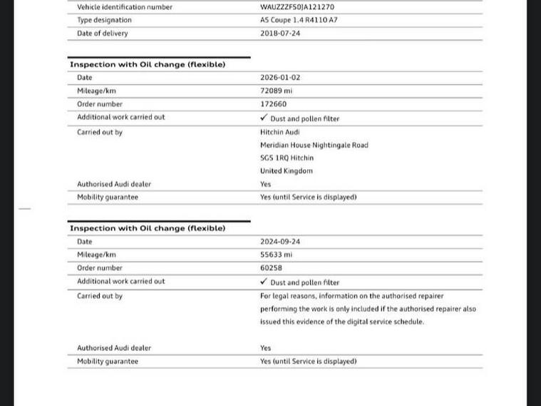 This 2018 Audi A5 TFSI S line offers excellent peace of mind with its MOT valid until March 2027 and a clear vehicle history check. This stylish coupe features a 1.4 litre petrol engine and is Euro 6 compliant. The S line trim enhances its appeal, and youll appreciate the convenience of Keyless Go and Keyless Entry. Driving is made more comfortable with Deluxe 3-Zone Electronic Climate Control, and staying connected is simple thanks to the Bluetooth Interface and the Audi Smartphone Interface, which supports both Android Auto and Apple CarPlay. The striking LED Headlights with LED Rear Lights and Dynamic Rear Indicators ensure excellent visibility. The Audi A5 TFSI S line is designed for efficiency and a refined driving experience. With a fuel economy of 52 miles per gallon, this vehicle offers a more economical choice compared to many others in its class. Its low CO2 emissions further highlight its efficient performance. This combination of impressive fuel economy and lower environmental impact makes it a sensible and appealing option for discerning drivers.