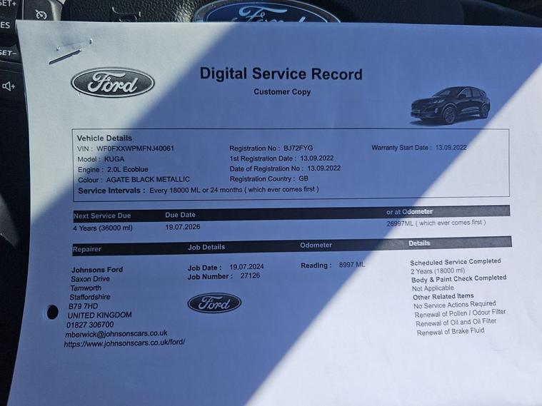 This 2022 Ford Kuga Titanium boasts an MOT valid all the way until September 2026, offering you peace of mind for years to come. This Euro 6 compliant 2.0L diesel model is presented in the Titanium trim, featuring full LED headlamps for excellent visibility. Inside, youll find convenient wireless charging for your devices, a premium Bang and Olufsen sound system for an enhanced audio experience, and automatic headlights with auto high low beam functionality. The Ford SYNC3 navigation system seamlessly integrates with Android Auto and Apple CarPlay, and includes Bluetooth connectivity for effortless communication and entertainment on the go. The Kuga Titanium is designed to impress with its thoughtful features. The inclusion of full LED headlamps and automatic headlights with auto high low beam demonstrates a commitment to advanced lighting technology, setting it apart from many other vehicles. Furthermore, the integration of wireless charging and the premium Bang and Olufsen audio system elevate the everyday driving experience, providing a level of comfort and sophistication that makes this Kuga a truly desirable choice.