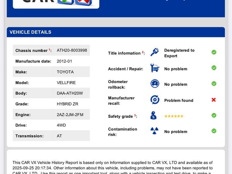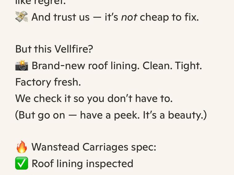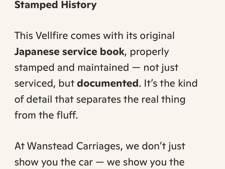 JAPANESE SERVICE HISTORY PRESET **PLEASE MENTION STOCK ID IM368 WHEN CALLING**GRADE 4 ( A VERY CLEAN EXAMPLE)**SEVEN SEATER**REGISTERED 24/03/2012**ULEZ COMPLIANT**4WD**XENON LIGHTS**REMOTE POWER SLIDE DOORS AND TAILGATE**REAR AMERA**17'' ALLOYS x4 BRIDGESTONE TYRES **DASH AND FLIP DOWN MONITORS WITH REMOTE**BLUETOOTH**LED INTERIOR LIGHTING**ALL AROND PARKING SENSORS**POWER ASSIST FRONT SEATS AND MEMORY POSITION DRIVER SEAT**SMART KEYS X2**DASH CAM**CLIMATE CONTROL WITH NANOE AIR FILTRATION**NON SMOKER INTERIOR**CRUISE CONTROL**TRACTION CONROL**ABS**CURTAIN AIRBAGS**AUTO FOLDING MIRRORS AND AUTO LIGHTS**FRONT, SIDE AND REAR CURTAINS**ALL TOYOTA RECALLS COMPLETED**DEALER ORIGINAL FLOOR CARPETS**WE ARE DELIGHTED TO BE SELLING THIS STUNNING WELL LOOKED AFTER LOW MILEAGE VELLFIRE HYBIRD 4WD THAT WE HAVE JUST IMPORTED PRESENTED IN PEARL WHITE WITH EXCELLENT CONDITION UPHOLSTERY JUST BEEN MOT AND HAD A ENGINE SERVICE/TRANSMISSION SERVICE WITH NO ADVISORIESDIAGNOSTICS REPORTS OF THE HYBIRD SYSTEM AND BATTERY SUPPLIEDThis vehicle comes with a verified VX report, equivalent to the UK HPI report, confirming no mileage discrepancies or hidden accidents. A certificate will be provided.This example drives as it should with no warning light's on the dashboard after extended test drive.The car drives beautifully, The automatic gearbox is excellent with seamless gear changesThe price includes 12 months Nationwide comprehensive PREMIER warranty from a uk leading warranty company, Covering over 8000 electrical and mechanical parts, The policy covers parts and labour cost's, Nationwide cover.Have complete peace of mind, with the Wanstead Carriages promise All our vehicles are HPI Checked, a copy of the certificate is given with each vehicle, every vehicle is subject to a rigorous multi point pre-delivery inspectionAA/RAC Inspection are Welcome/12 Months AA Breakdown cover also includedWE ARE VERY PROUD TO BE A PART OF THE AA CARS STANDARDS WHICH IS APPROVED BY THE CHARTERED TRADING STANDARDS INSTITUTE, SO YOU CAN PURCHASE YOUR NEXT VEHICLE FROM WANSTEAD CARRIAGES IN CONFIDENCE.