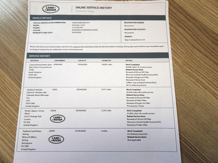 We are delighted to offer for sale this very special and low mileage Land Rover Defender 110 SD4 First Edition. The First Edition models were fully loaded, however this one has a host of options (over £4000) which makes it really stand out from the crowd and presents as a very individual vehicle. Owned and ran by our Managing Director for the past 20 months and with just the one previous keeper from new. It is complimented by a Full Service History, having had three services ( last completed June 2025), despite its very low mileage.This First Edition variant is equipped with a suite of desirable features, including the convenience of Android Auto and Apple CarPlay for seamless smartphone integration, and advanced safety with Blind Spot Assist. Enhancing the driving experience are the striking Matrix LED Headlights with Signature Daytime Running Lights and a spacious Sliding Panoramic Roof, offering an open and airy cabin feel.The Defender 110 is renowned for its practicality, boasting a large boot space perfect for all your adventures. Its acceleration is impressive, reaching 0-60mph in a swift 8.7 seconds, demonstrating a strong balance of power and efficiency. The towing weight of 3500 kg further underlines its versatility, making it suitable for a wide range of towing needs. These highlights collectively indicate a vehicle that offers superior capability and comfort compared to many others in its class. As a Euro 6 compliant model, it features a robust 2.0L Diesel engine paired with a Four Wheel Drive system, ensuring capable performance. First to see and drive this truly one off Defender will buy. Call us to arrange a viewing or test drive.The sale does not include the private plate shown on the photographs.