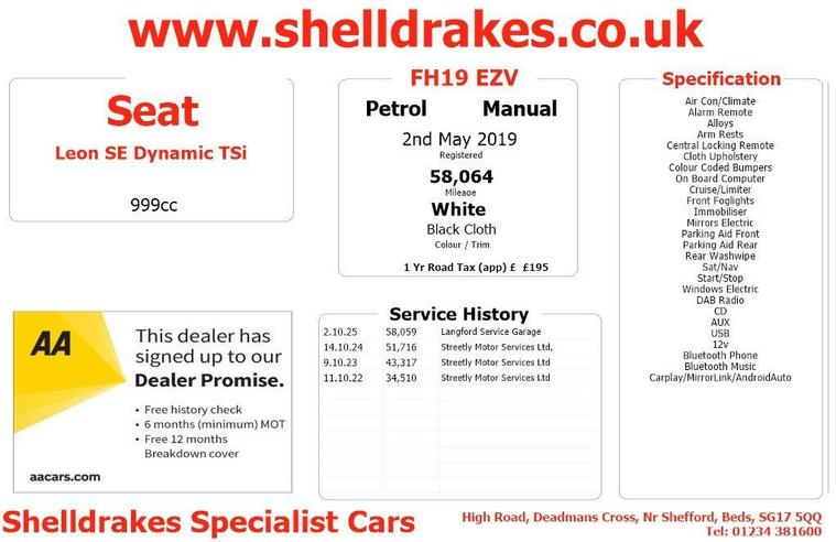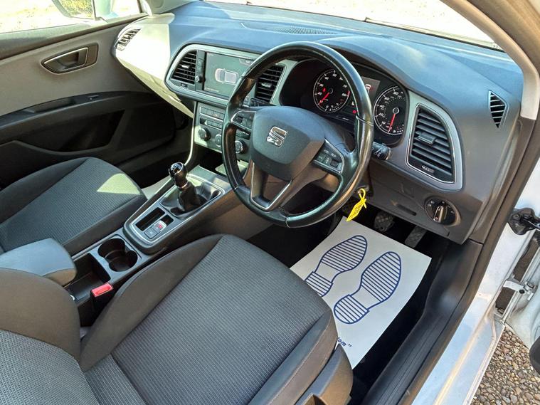 Seat Leon 1.0 TSI SE Dynamic in White with Black/Grey Interior. 999cc, 6 Speed, Manual. Comes with Handbooks and Locking Wheel Nut. Specification includes: Airconditioning, Apple Carplay/Mirror Link, Bluetooth Phone and Music, Front and Rear Parking Aids, Sat Nav, Remote Alarm/Central Locking, Alloys, Central Armrest, Onboard Touchscreen Computer, Cruise Control, Front Foglights, Electric Door Mirrors, Rear Washwipe, Start/Stop Functionality, Electric Windows, DAB Radio, CD, Aux & USB Points, 12v Socket. We are an AA Approved Dealer, 12 Months free AA Membership included on all our vehicles as well as a free AA History Check. 100% Finance options available with no administration fee and low interest rates, subject to status. Please ring for details. Part Exchange Welcome. Extended Warranties Available..