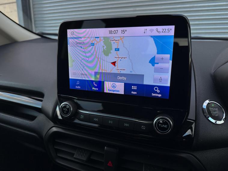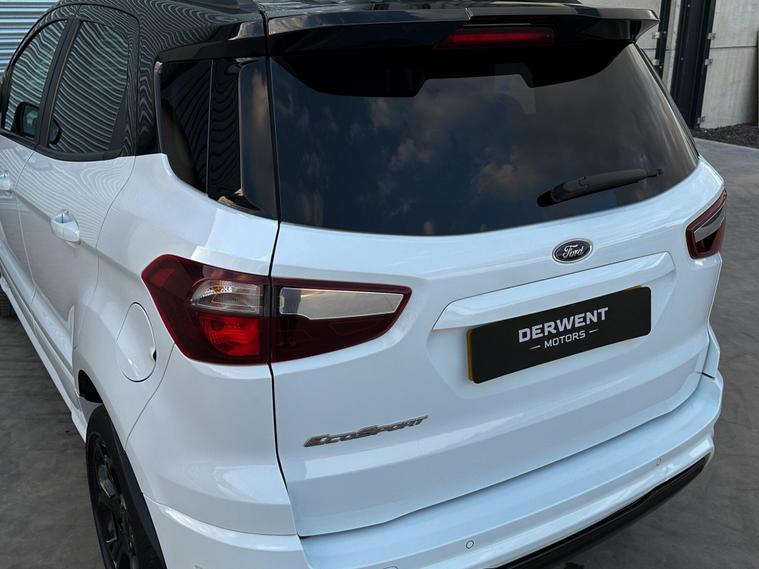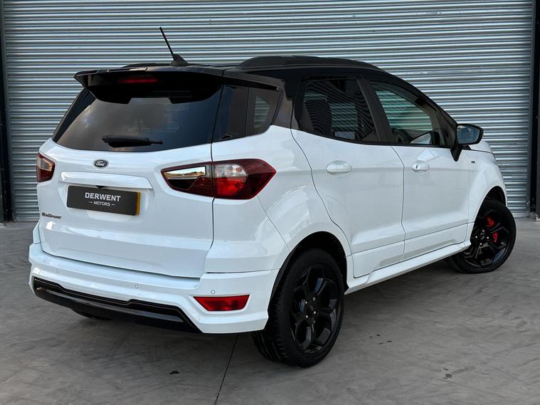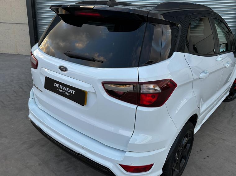 Welcome to Derwent MotorsHere we have a 2019 (19) Ford EcoSport 1.0T EcoBoost ST-Line, finished in the more desirable Frozen White with just 41, 000 miles and two owners from new. Powered by an award-winning 1.0L EcoBoost petrol engine, this Euro 6 ULEZ-compliant model combines sporty performance with excellent economy of up to 47 mpg.This ST-Line edition stands out with its Black contrast roof and mirrors, 17'' gloss black alloys with red brake calipers, and the distinctive ST-Line body styling kit. Inside, you’ll find the hard wearing Dinamica fabric and Salerno leather trim with red stitching, adding to the sporty feel of this particular Ecosport. It’s also packed with technology including Ford SYNC 3 with navigation and an 8'' touchscreen, Apple CarPlay/Android Auto, rear view camera with sensors, and a Quickclear heated windscreen.The Ecosport is super practical offering flexible 60/40 split-folding rear seats, an adjustable boot floor, and useful roof rails. Safety and convenience are enhanced with automatic headlights, rain-sensing wipers, and a full suite of airbags and stability systems.Key Features & Upgrades:17'' Gloss Black Alloys with Red Brake CalipersAgate Black Contrast Roof & MirrorsRear View Camera with Parking SensorsFord SYNC 3 with Navigation & 8'' TouchscreenApple CarPlay & Android AutoQuickclear Heated WindscreenST-Line Bodystyling KitSports Suspension & ST-Line Interior with Red StitchingWith a fresh 12 months MOT and recent service carried out, this EcoSport is ready to go.All our vehicles are HPI clear, and we are proud to be an AutoTrader Highly Rated Dealer 2021, 2022, 2023, 2024 & 2025 – buy with total confidence.? sales dealer's website 01332462741 / 01332462741? Text/WhatsApp: 01332462741.