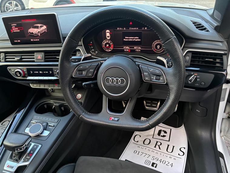 This 2019 Audi RS5 TFSI V6 Sport Edition is a remarkable example of performance and luxury. Featuring a powerful 2.9L petrol engine and a sophisticated four wheel drive system, this Euro 6 compliant model offers an exhilarating driving experience. The Sport Edition trim boasts impressive notable features, including striking LED headlights with RS air intake, a deluxe three zone electronic climate control for personalised comfort, and a light and rain sensor for automatic headlight activation. For added convenience and enjoyment, it also comes equipped with a panoramic glass sunroof and Audi Side Assist for enhanced blind spot monitoring.The RS5 truly stands out with its exceptional performance, accelerating from 0 to 62mph in a mere 3.9 seconds, a figure that demonstrates its superior speed compared to many other vehicles in its class. Beyond its impressive acceleration, this Audi RS5 also offers practicality with its large boot space, making it a versatile choice for both spirited drives and everyday use. The combination of its dynamic capabilities, advanced technology, and thoughtful design makes this RS5 Sport Edition a compelling proposition.This car comes with full service history and has just had a fresh service by ourselves and a 200 point health check in our workshop. Included in the preparation we also do a full electronic diagnostic health check with a printout for peace of mind.We have also had the car through our bodyshop for inspection and quality checks, All our cars come fully valeted including a full polish and wax.Please contact a member of our team to arrange a private viewing appointment at our forecourt in Retford, Nottinghamshire . With all main dealership facilities, we offer extremely competitive part exchange prices, finance options and nationwide delivery at a time convenient to you!# Every Vehicle comes with 3 months warranty as standard and breakdown cover and a full Hpi Certificate # please check specifications prior to purchase.