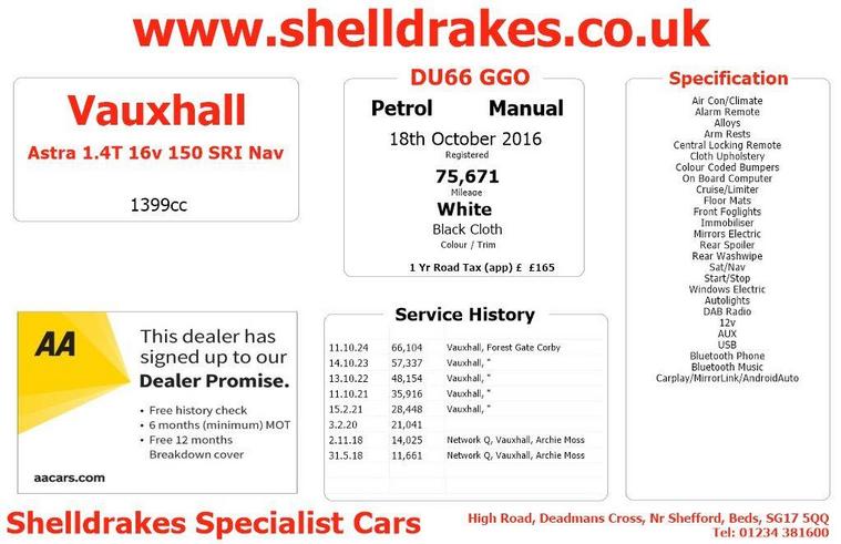 Astra 1.4i Turbo SRi in White with Black Sports Interior. 1399cc, 6 Speed, Manual. Comes with Handbooks, Service Book, Spare Key and Locking Wheel Nut. Specification includes: Carplay/Mirror Link/Android Link, DAB Radio, Sat Nav, Aircon, Remote Alarm/Central Locking, Cruise/Limiter Control, Front Foglights, Autolights, Electric Windows, SRI Alloys, Central Armrest, Colour Coded Bumpers, Onboard Computer, Floor Mats, Electric Door Mirrors, Rear Spoiler, Rear Washwipe, 12v Socket, Aux Point, USB Point. We are an AA Approved Dealer, 12 Months free AA Membership included on all our vehicles as well as a free AA History Check. 100% Finance options available with no administration fee and low interest rates, subject to status. Please ring for details. Part Exchange Welcome. Extended Warranties Available..