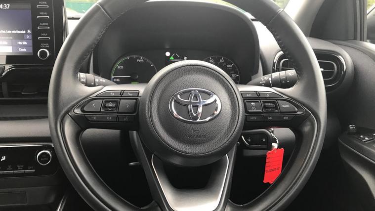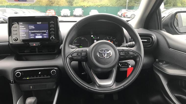 This 2023 Toyota Yaris VVT-h Icon is a Toyota manufacturer approved vehicle with a full service history and only one owner from new, offering peace of mind. This Euro 6 compliant model boasts a 1.5L petrol hybrid engine and comes with a 12 month warranty. Notable features include Toyota Safety Sense 2 with adaptive cruise control, a reversing camera with rear parking assistance, Bluetooth connectivity, automatic headlights, and automatic air conditioning with climate control.The Yaris Icon stands out with its impressive fuel economy, achieving a remarkable 69 mpg, and its low CO2 emissions, indicating it is more efficient than many other vehicles in its class. This combination of economical running costs and advanced safety and convenience features makes this Yaris a compelling choice for those seeking a reliable and modern hatchback..