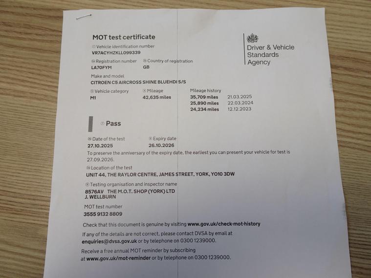 We are delighted to offer for sale this 2021 Citroen C5 Aircross BlueHDi Shine which boasts a full service history, offering you complete peace of mind. This stylish SUV is equipped with a 1.5 litre Euro 6 diesel engine, delivering an impressive fuel economy of 57 miles per gallon. The Shine trim level ensures a premium experience, featuring automatic dual zone climate control for personalised comfort, and a park city camera pack with front sensors and a rear camera to aid your parking manoeuvres. You'll also appreciate the acoustic laminated windscreen with rain and brightness sensors, which automatically activate the headlights, and the convenience of keyless entry and start.The C5 Aircross also offers a generous boot space, making it ideal for families or those who need extra room for luggage. Its low CO2 emissions are a testament to its efficient design, and it falls into a low insurance group, which can help to reduce your running costs. These highlights demonstrate how this particular vehicle offers excellent value and efficiency compared to other similar models on the market. Supplied with a fresh Service , 12 Months MOT and our own Workshop Inspection for its new owner . Impressive economy, and practicality make this Citroen SUV a standout choice!.