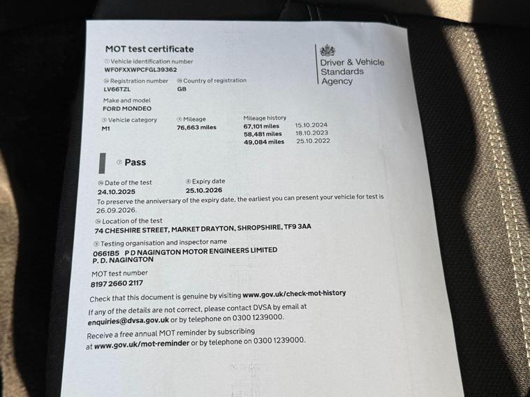 Boasting exceptionally low mileage for its age, this 2016 Ford Mondeo TDCi Zetec presents a compelling proposition for discerning buyers. With only one previous owner and a full service history, including its last service at 72, 525 miles on 18th June 2025, this vehicle has been well maintained, is fabulous and smooth to drive and just had a new MOT. It features a 1.5L Euro 6 diesel engine, offering an impressive fuel economy of 74 mpg, and comes with a 6 month warranty for your peace of mind. The Zetec trim ensures a comfortable and convenient driving experience, enhanced by notable features such as Satnav DAB media system with USB/Bluetooth handsfree, dual zone climate control with rear air conditioning, and front and rear parking sensors for effortless manoeuvring. All handbooks. 2 x keys. We sell with 6 Months Warrantywise Platinum Warranty. 12 Months AA Breakdown Membership included. AA Driveaway 5 Day Insurance available - Only £44.99 NEED FINANCE? No Problem - SAF Registered. Simply click 'Apply for finance' on our website dealer's website We are a FCA registered dealership. Prime or subprime finance. Excellent finance rates starting from as low as 11.1% APR (Subject to status and terms and conditions) For any further information and details to view please contact David, who has over 50 years personal Motor trade experience! Delivery to your door is available, please ask for a quote. More images when valeted, no dings or scratches and faultless to drive as you would expect from a well maintained car.This Ford Mondeo stands out from similar vehicles due to its exceptional efficiency and cost of ownership. Its low CO2 emissions and low insurance group contribute to significantly reduced running costs, making it an economical choice. Furthermore, the provision of a 12 month MOT on purchase assures you of its roadworthiness. This Mondeo is a well cared for example, offering a blend of practicality, comfort, and efficiency that is hard to match..