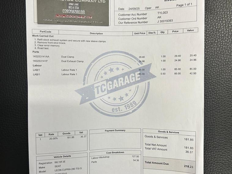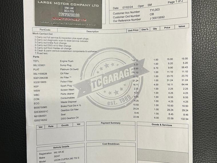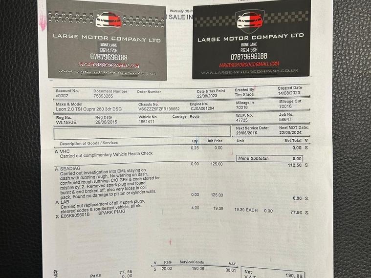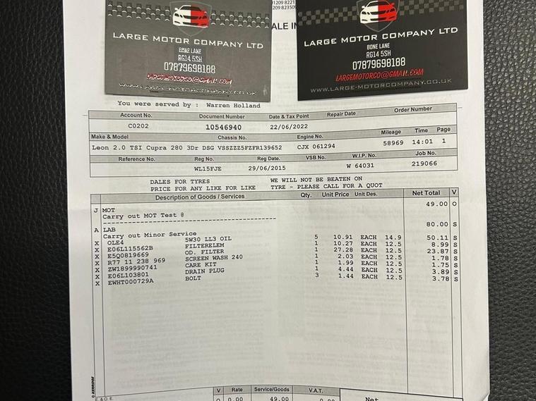 This 2015 SEAT Leon TSI Cupra 280 boasts a full service history, with its last service completed at 96, 754 miles, offering you peace of mind. This Euro 6 compliant 2.0 litre petrol model comes with a 3 month warranty and a 12 month MOT provided on purchase. It features the desirable CUPRA Black Line Pack and CUPRA Orange Line Pack, alongside the CUPRA Sub8 Performance Pack. Inside, you'll find a Navigation System High and the SEAT Sound System for an enhanced driving experience.Experience exhilarating performance with this SEAT Leon, capable of accelerating from 0 to 62mph in just 5.7 seconds, a testament to its sporty nature. The large boot space ensures practicality for everyday use and longer journeys. These features, combined with its comprehensive service history and included warranty, demonstrate the exceptional value and quality of this particular Cupra 280 model..