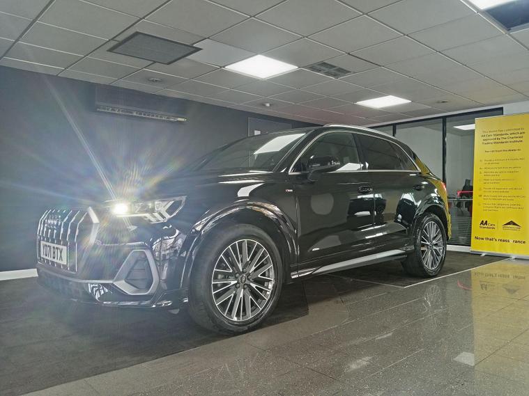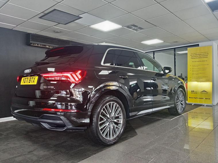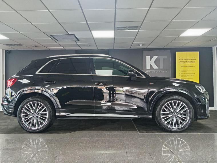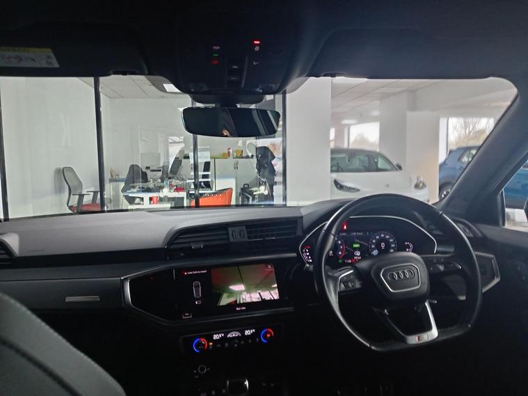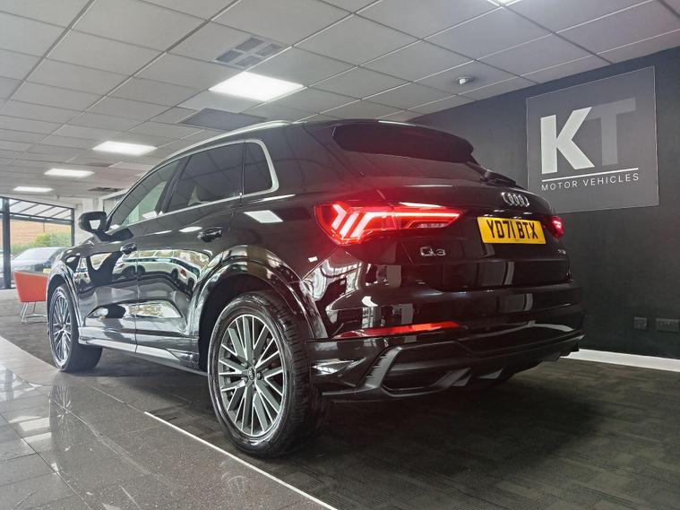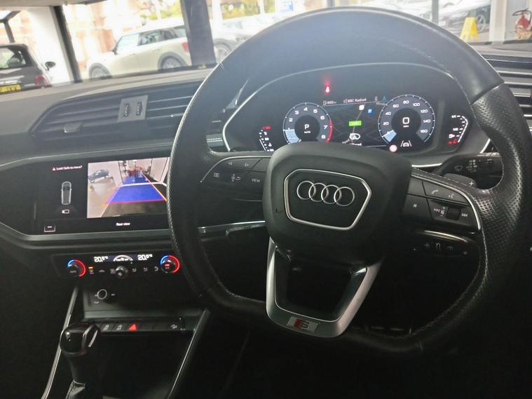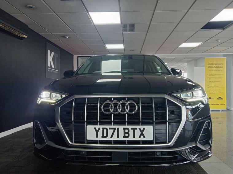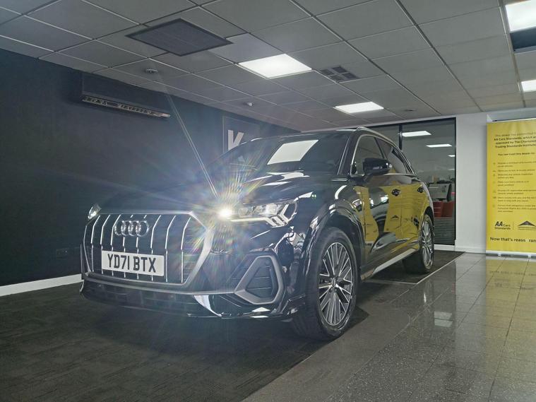 This 2021 Audi Q3 TFSI S line boasts exceptionally low mileage for its age, having covered just 22, 700 miles, and comes with a clear vehicle history check and a full service history. This Euro 6 compliant 1.5 litre petrol model is presented in the sought after S line trim, featuring a panoramic glass sunroof that opens for an enhanced driving experience. Inside, you'll find twin leather sport seats in black with stylish rock grey stitching, complemented by a flat bottomed, three spoke leather trimmed multi function sport steering wheel complete with gear shift paddles. The exterior is enhanced by 19 inch alloy wheels in a contrasting grey diamond cut finish, and the vehicle is equipped with LED headlights, daytime running lights, and dynamic rear indicators.The Q3 TFSI S line offers a responsive drive, accelerating from 0 to 62 miles per hour in 9.4 seconds, demonstrating its performance capabilities. This particular example benefits from a 6 month warranty for your peace of mind, and its MOT is valid until October 2026, indicating its excellent roadworthiness. These factors, combined with its comprehensive features and low mileage, position this Audi Q3 as a superior choice compared to other vehicles of its kind on the market..