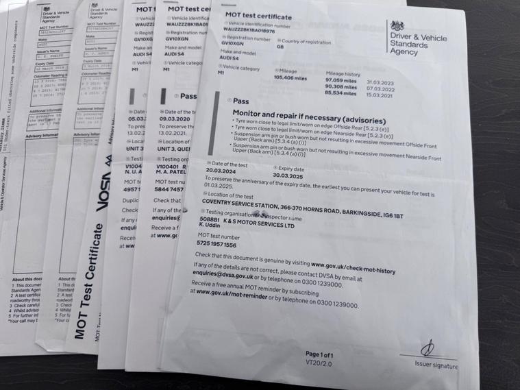 2010 Audi S4 Avant. Currently one of two 2010 S4's we have available. This is in very good condition and drives very well. Very nice black leather/alcantara interior. 117, 00 miles with full service history which consists of a mixture of Audi main dealer and performance specialists with the last service carried out November 2025. This S4 has a stack of invoices for works carried out throughout it's life. Most recently it had a new clutch and flywheel fitted in May 2025, a new clutch master cylinder in 2024 and new thermostat and water pump in 2021 at 88k. Audi multimedia system with Sat Nav, DAB radio, bluetooth and USB connectivity including a Bang & Olufsen advanced sound system. Front and Rear parking sensors. Climate control air conditioning. Cruise control. 19'' Alloy wheels with very good Goodyear Eagle F1 tyres. Comes with 3 months Bluechip warranty with option to extend. Part exchange welcome. Check our website for more quality cars..