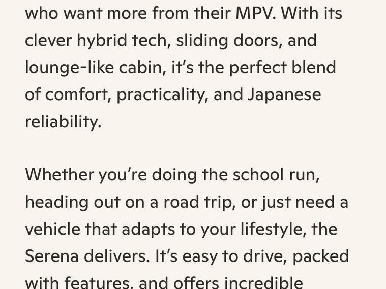 **PLEASE MENTION STOCK ID IM 389 WHEN CALLING**EIGHT SEATER**ULEZ COMPLIANT**26/12/2014 REGISTERED DATE** GRADE 4 ( A VERY CLEAN EXAMPLE)**EIGHT SEATER**LED FOG LIGHTS**AND HEADLIGHTS**DEALER OPTION: REAR SPOILER**REMOTE POWER SLIDE DOORS WITH PULL UP BLINDS**ALL AROUND VIEW CAMERAS**DASH AND FLIP DOWN MONITORS WITH REMOTE**AUTECH 16'' ALLOYS WHEELS**TRACTION CONTROL**CRUISE CONTROL**LANE DEPARTURE WARNING**BRAKING ASSIST**CLIMATE CONTROL**BLUETOOTH**DASH CAM**IDLE STOP FUNCTION**LEATHER STEERING WHEEL**ABS**INTELLIGENT KEYS (X2)**WINKER MIRRORS**PRIVACY GLASS**ORIGINAL FLOOR MATS**ALL NISAN RECALLS COMPLETED**LOTS MORE....WE ARE DELIGHTED TO BE SELLING THIS STUNNING WELL LOOKED AFTER LOW MILEAGE NISSAN SERENA ( HFC20) THAT WE HAVE JUST IMPORTED ..PRESENTED IN METALLIC BLACK COLOUR CODE (G41) WITH EXCELLENT CONDITION CLOTH UPHOLSTERYJUST BEEN MOT AND A ENGINE SERVICE AND TRANSMISSION SERVICE HAS BEEN COMPLETED WITH NO ADVISORY...This vehicle comes with a verified VX report, equivalent to the UK HPI report, confirming no mileage discrepancies or hidden accidents. A certificate will be providedThis example drives as it should with no warning light's on the dashboard after extended test drive.The car drives beautifully, The automatic gearbox is excellent with seamless gear changes, The price includes 12 months Nationwide comprehensive PREMIER warranty from a uk leading warranty company, Covering over 8000 electrical and mechanical parts, The policy covers parts and labour cost's, Nationwide cover.Have complete peace of mind, with the Wanstead Carriages promise All our vehicles are HPI Checked, a copy of the certificate is given with each vehicle, every vehicle is subject to a rigorous multi point pre-delivery inspection, AA/RAC Inspection are Welcome/12 Months AA Breakdown cover also includedWE ARE VERY PROUD TO BE A PART OF THE AA CARS STANDARDS WHICH IS APPROVED BY THE CHARTERED TRADING STANDARDS INSTITUTE, SO YOU CAN PURCHASE YOUR NEXT VEHICLE FROM WANSTEAD CARRIAGES IN CONFIDENCE**.