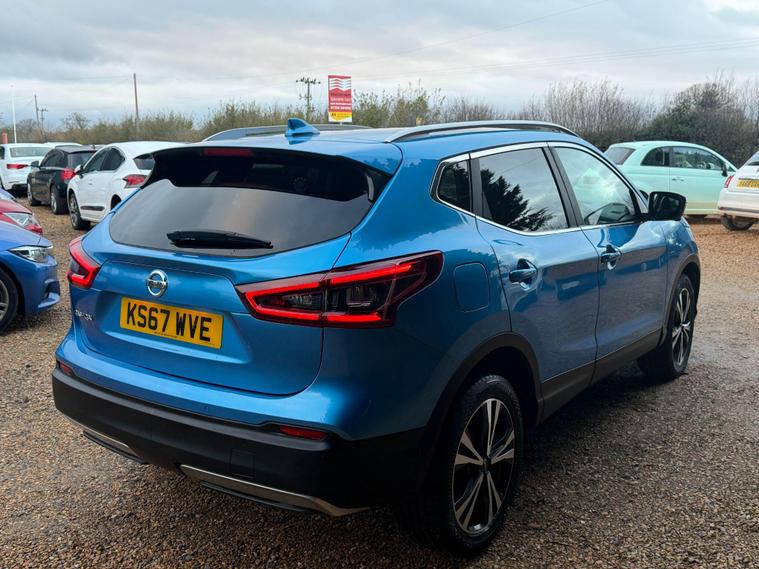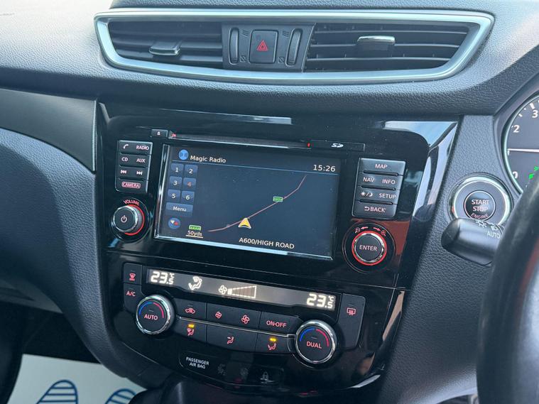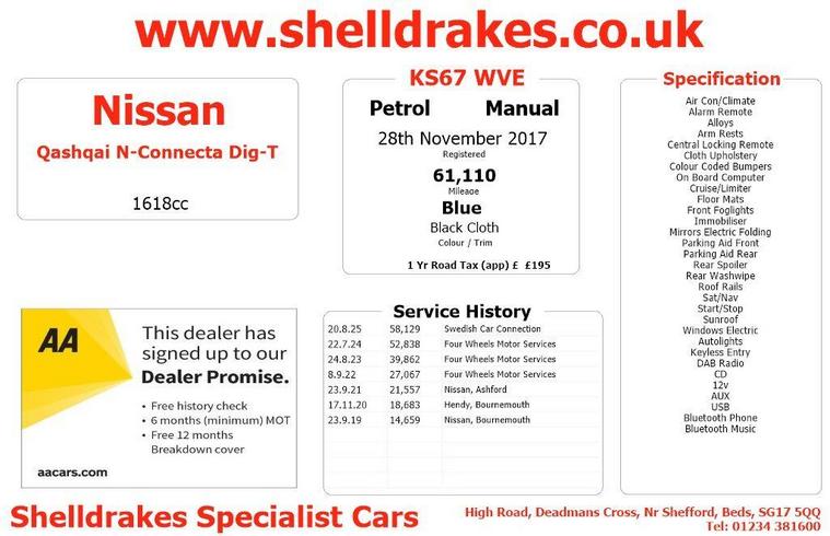 Nissan Qashqai 1.6 DIG TN- Connecta in Metallic Blue with Black Interior. 1618cc, 6 Speed, Manual, Petrol. Comes with Handbooks, Service Book, Spare Key and Locking Wheel Nut. Specification Includes: Panoramic Sunroof, Climate Control, Alloys, Bluetooth Connectivity, 360 Parking Cameras, Remote Alarm/Central Locking, Keyless Entry, Cruise/Limiter, Front Foglights, Electric Folding Mirrors, Rear Spoiler, Rear Washwipe, Roof Rails, Sat Nav, Electric Windows, Floor Mats, Colour Coded Bumpers, Onboard Computer, Central Armrest, DAB Radio, 12v Socket, CD, 2 x 12v Sockets, Aux, USB. We are an AA Approved Dealer, 12 Months free AA Membership included on all our vehicles as well as a free AA History Check. 100% Finance options available with no administration fee and low interest rates, subject to status. Please ring for details. Part Exchange Welcome. Extended Warranties Available..