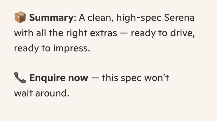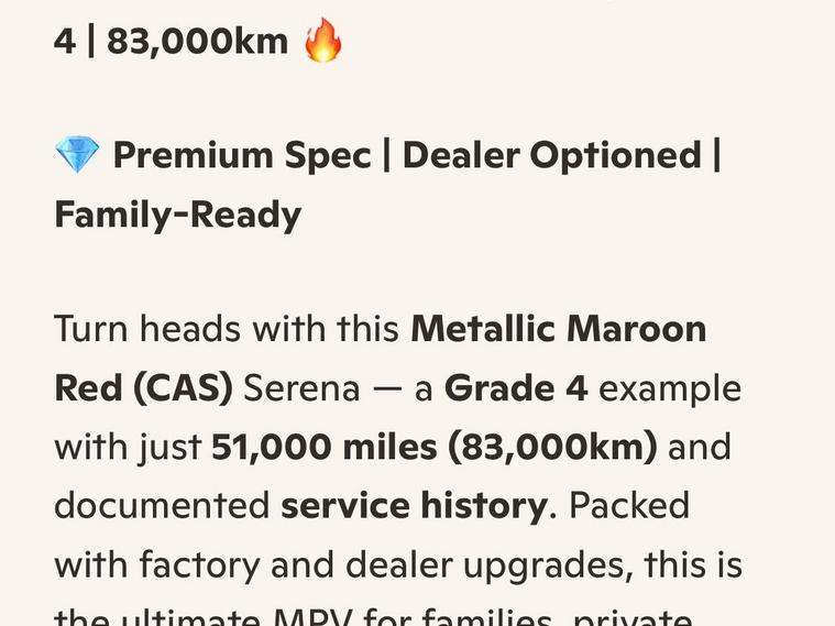 JAPANESE SERVICE HISTORY PRESENT**PLEASE MENTION STOCK ID IM 388 WHEN CALLING**EIGHT SEATER**ULEZ COMPLIANT**27/05/2015 REGISTERED DATE** GRADE 4 ( AVERY CLEAN EXAMPLE)**EIGHT SEATER**AIR BAGS**FRONT FOG LIGHTS**WINKER MIRRORS**PRIVACY GLASS**DEALER OPTION:REAR SOILER**REMOTE POWER SLIDE DOORS WITH PULL UP BLINDS**ALL AROUND PARKING SENSORS**ALL ROUND VIEW CAMERAS**LANE DEPARTURE WARNING**BRAKING ASSIST**DASH AND FLIP-DOWN MONITORS WITH REMOTE**FACTORY 16'' ALLOYS WHEELS**BLUETOOTH**IDEL STOP FUNCTION**TRACTION CONTROL**CLIMATE CONTROL**ABS**AIRBAGS**CRUISE CONTROL**LEATHER STEERING WHEEL**ORIGINAL FLOOR MATS**ALL NISSAN RECALLS COMPLETED**WE ARE DELIGHTED TO BE SELLING THIS STUNNING WELL LOOKED AFTER LOW MILEAGE NISSAN SERENA ( HFC26) THAT WE HAVE JUST IMPORTED ..PRESENTED IN METALLIC MAROON RED ( CAS - COLOUR CODE) WITH EXCELLENT CONDITION CLOTH UPHOLSTERYJUST BEEN MOT AND A ENGINE SERVICE AND TRANSMISSION SERVICE HAS BEEN COMPLETED WITH NO ADVISORY...This vehicle comes with a verified VX report, equivalent to the UK HPI report, confirming no mileage discrepancies or hidden accidents. A certificate will be providedThis example drives as it should with no warning light's on the dashboard after extended test drive.The car drives beautifully, The automatic gearbox is excellent with seamless gear changes, The price includes 12 months Nationwide comprehensive PREMIER warranty from a uk leading warranty company, Covering over 8000 electrical and mechanical parts, The policy covers parts and labour cost's, Nationwide cover.Have complete peace of mind, with the Wanstead Carriages promise All our vehicles are HPI Checked, a copy of the certificate is given with each vehicle, every vehicle is subject to a rigorous multi point pre-delivery inspection, AA/RAC Inspection are Welcome/12 Months AA Breakdown cover also includedWE ARE VERY PROUD TO BE A PART OF THE AA CARS STANDARDS WHICH IS APPROVED BY THE CHARTERED TRADING STANDARDS INSTITUTE, SO YOU CAN PURCHASE YOUR NEXT VEHICLE FROM WANSTEAD CARRIAGES IN CONFIDENCE**.