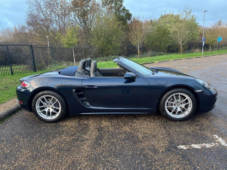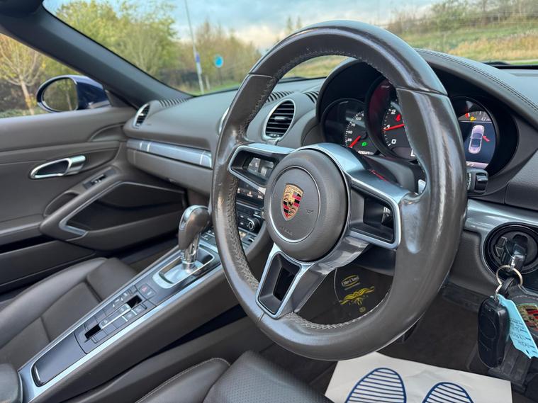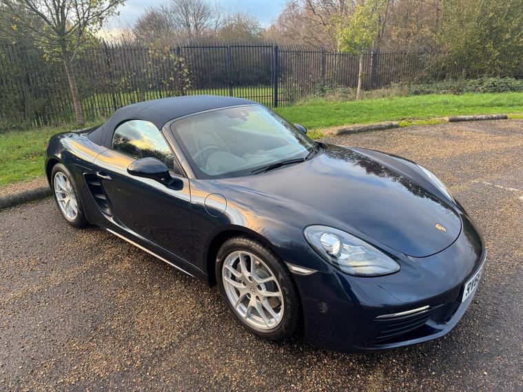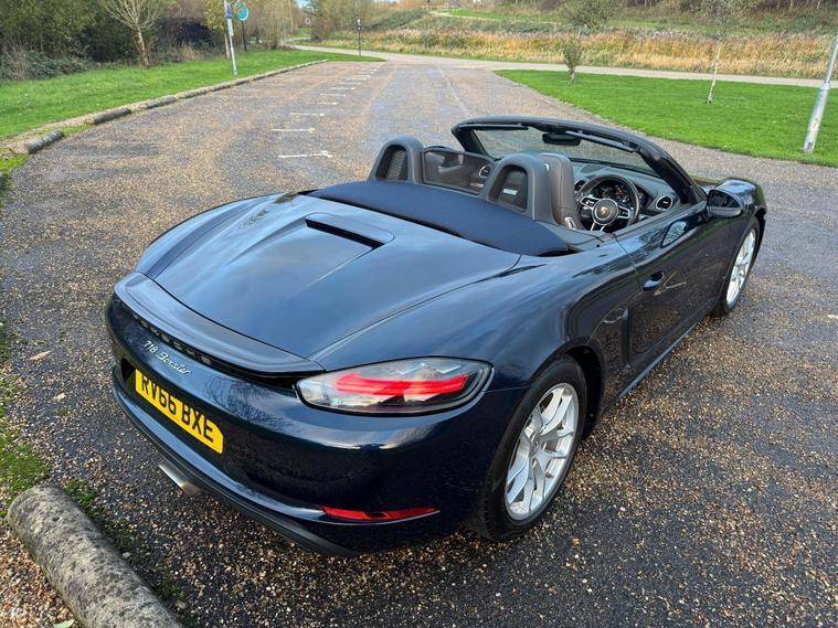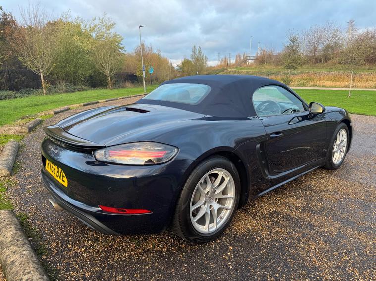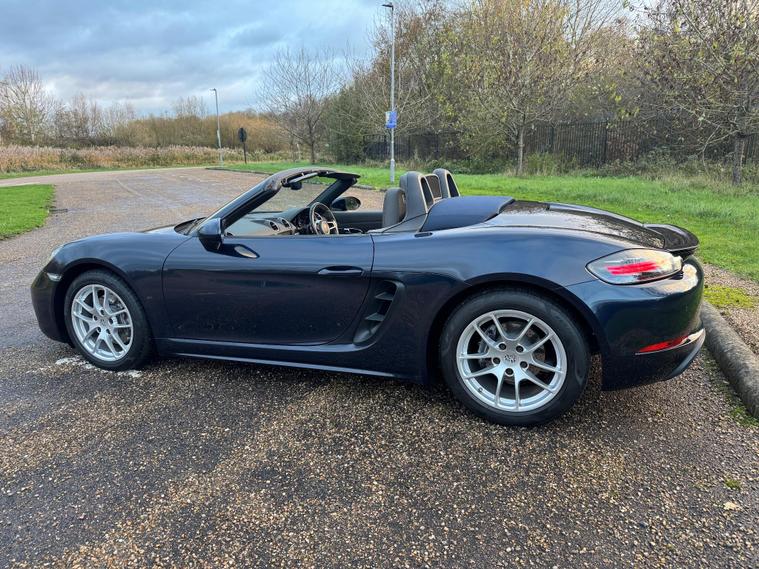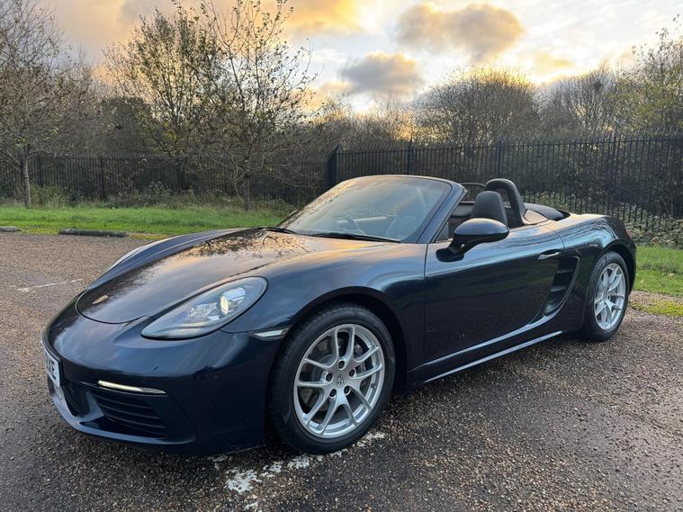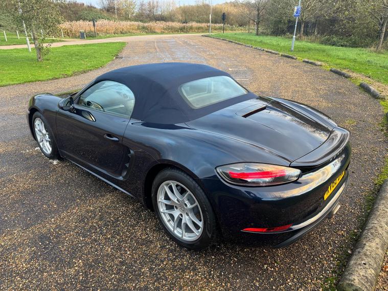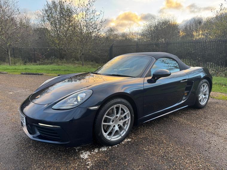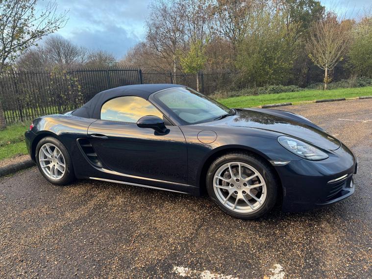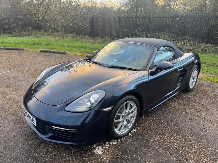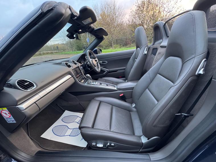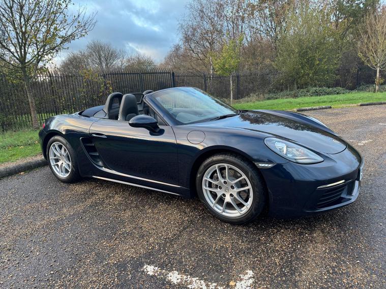 We are pleased to offer this Porsche 718 Boxster that has just arrived with us. Presented in the great combination of Night Blue metallic and Agate Grey Leather, the car comes specified with the pleasing options of 18'' Cayman wheels, Auto dimming mirrors and integrated rain sensor, Cruise control, Digital radio, Electrically folding mirrors with courtesy lighting, Fully electric 14-way sports seats, Leather package, Navigation module for Porsche communication management (PCM), Park assist front and rear, Passenger footwell storage net, PDK gearbox, Heated seats, and Speed limit display. Purchased directly from the last owner who owned the vehicle since 2019. when it had covered a mere 300 miles. Supplied by Porsche Mayfair, its first service was carried out by them at 311 miles in Feb 19. Its next was with renown Porsche specialist R.G.A at 21658 miles in March 21. Since then Porsche Centre West London serviced at 39350 in October 22 and 53338 miles in September 24. All services have been in line with Porsces 2 year or 20k service schedule. Alongside the stamped book there are invoices for all supplementary work including in May this year all brake discs and pads were replaced..