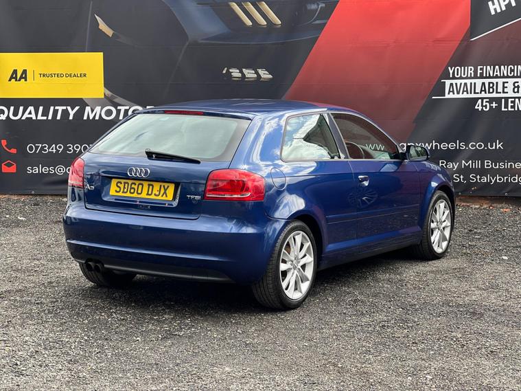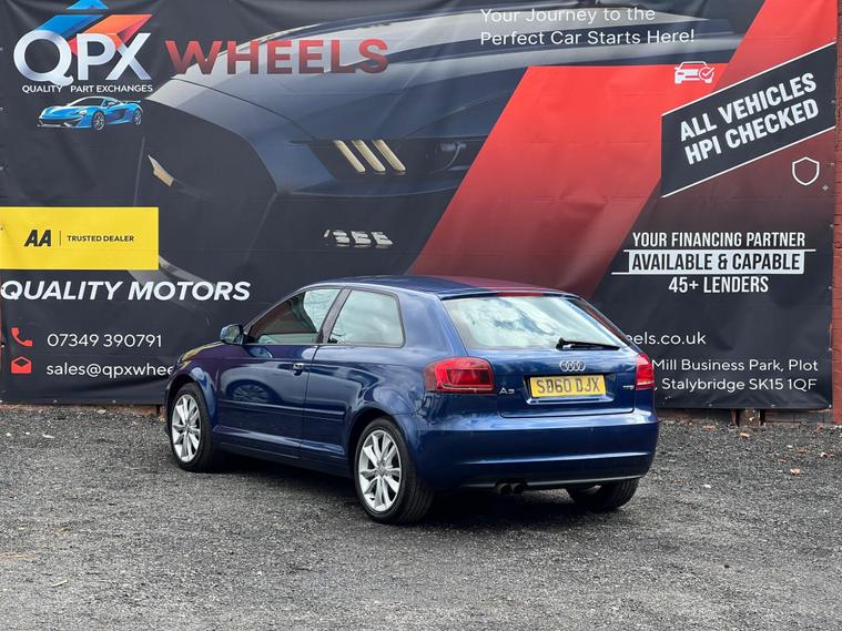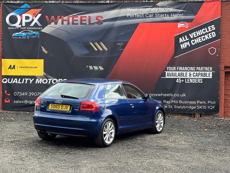 Enjoy premium performance and everyday practicality with this stylish 2010 Audi A3 1.8 TFSI Sport S tronic. With only 74, 005 miles, two careful owners, and full ULEZ compliance, this sleek blue 3-door hatchback delivers a refined drive through its smooth S tronic automatic gearbox and powerful TFSI engine. A great balance of efficiency, comfort, and Audi quality.Anti-lock Braking System (ABS)Electronic Stability Programme (ESP)Traction Control (ASR)Electronic Differential Lock (EDL)Tyre Pressure Monitoring SystemDriver and front passenger airbagsSide airbags and curtain airbagsISOFIX child seat anchor pointsRemote central lockingImmobiliser and alarmPower-assisted steeringSport front seatsCloth sport upholsteryLeather multifunction steering wheelDual-zone air conditioning6-speaker audio system with CD/MP3 + AUX inputDriver information system (DIS)***EXTENDED WARRANTY AVAILABLE****DUE TO HIGH DEMAND WE RECOMMEND A VIEWING IN ADVANCE, which you can do via the website or by calling us at +44 7349 390791.Our friendly team will look after you before, during and after the sales. We will help you with taxing the vehicle, completing official forms, and we will make sure that you, your family and loved ones are safe on the road. We also offer a wide range of warranties and finance to meet your needs. WHO WE AREWe are a car dealership with 16 years of experience, based in Clarence Street, Stalybridge, SK15 1QF. We are 100% sure that we can find you the right vehicle as we offer over 150 cars for sale at any time. OUR QUALITY PROMISE- Every car comes with our FREE 3 Months warranty- We offer a fresh MOT for all vehicles due for one within the next 3 months. - All our vehicles are HPI Clear and undergo a 39-Point check, conducted by professional inspectors. - Every vehicle is valeted and sanitised to a high standard. - We are able to offer delivery nationwide at competitive prices, don't hesitate to contact us for a quote.FINANCE, PART EXCHANGE OR A STRAIGHT PURCHASE IS AVAILABLE. QPX Wheels Team.https:/ dealer's website