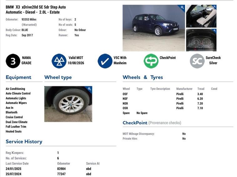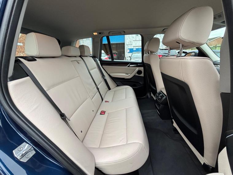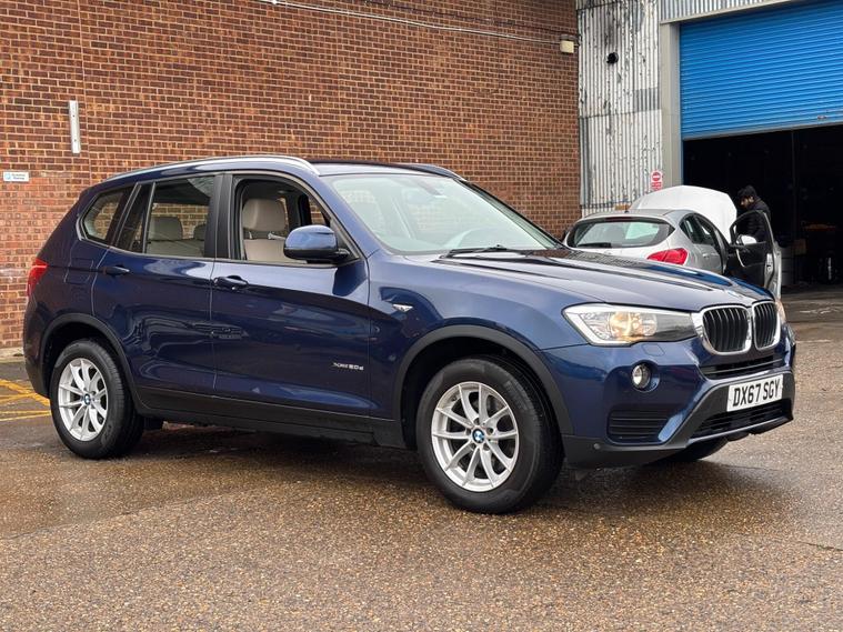 This 2017 BMW X3 20d SE boasts a pristine history, having had only one owner and a Full vehicle service history check. This four wheel drive SUV is powered by an efficient 2.0L Euro 6 diesel engine, offering an impressive fuel economy of 54 miles per gallon. The SE trim level is enhanced by the SE Plus Package, which includes a reversing assist camera for easier parking, a heated seats for comfort in colder weather, and enhanced Bluetooth telephone preparation with USB audio interface and voice control. Inside, the cabin is further refined with attractive Burled Walnut wood interior trim.The BMW X3 20d SE demonstrates its capability with a brisk 0-62mph acceleration time of just 8.1 seconds, indicating a strong performance for its class. Its low CO2 emissions are also a notable advantage, suggesting a more environmentally conscious choice compared to many similar vehicles. Furthermore, the generous boot space provides ample room for luggage, shopping, or sports equipment, making it a practical and versatile option for families and individuals alike.39/39 scored on a Mechanical Surecheck report, ULEZ Complaint and 2 Keys. Full service schedule is pictured. Once the customer has viewed and satisfied themselves with the vehicle delivery is available. Viewing is strictly via appointment only. MOT Till 10/08/26, Advisory has been cleared as we have changed the Brake pads..
