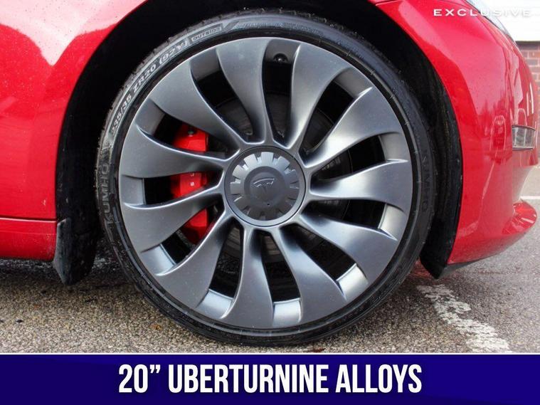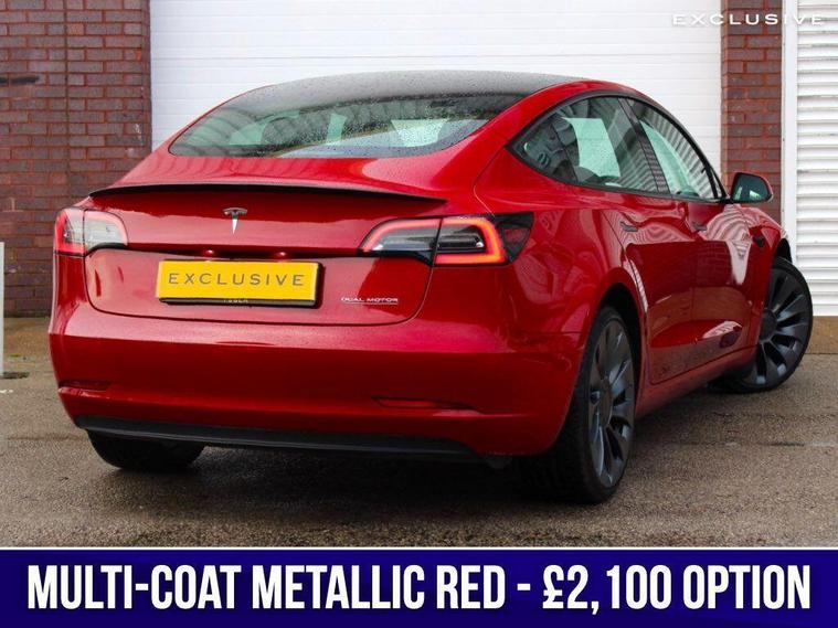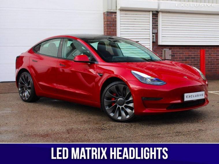 We are delighted to present this 1 owner, ultra low mileage , Tesla Model 3 Performance benefitting from the upgraded metallic multi-coat red paintwork, which was the most expensive paint option (£2, 100) With list price of c. £62, 000 brand new.This Tesla has an extensive specification which includes the 20'' alloys, red brake calipers, premium black leather, panoramic roof, satellite navigation, surround cameras, heated front and rear seats, heated steering wheel, carbon fibre trim, track mode and much more. ---|--- TESLA WARRANTY UNTIL 07/2027 & TESLA BATTERY WARRANTY UNTIL 07/2031---|---So let us tell you about our day out with the Tesla. We are simply in awe of this fantastic wonder-car , achieving 60 mph in 3.1 seconds and a top speed of 162 mph...calling this a car would be a great injustice to the motor industry. We are so excited when writing this ... and you really do need to visit and let us drive you, or if you prefer let the autopilot, one of our favourite options, drive you to experience this fantastic technological marvel. Really you must ... it really is that good! We think that owning this car is akin to owning an Apple product, simple yet brilliant in both form and function and seldom out of date thanks to its over the air updates. Yep. Instead of having to go to a dealer or service centre to get your car updated, Tesla pushes updates to its cars over the net like it’s a massive, wheeled smartphone. These updates add new features, improve existing ones and fix bugs. Theory is however old your Model 3, it will always have all the latest features, provided you’ve let it update (you don’t have to be in or anywhere near the car). This is clever and we like it very much indeed. It’s rapid, quiet, refined, spacious, fantastic grip and road manners thanks to its all wheel drive, it has an excellent driving range of over 300 miles in real-world driving, you can recharge it easily, quickly and reliably at Tesla's Supercharger network. ---|---***Other features can be purchased from Tesla such as: Full Self Driving, Enhanced Autopilot***.