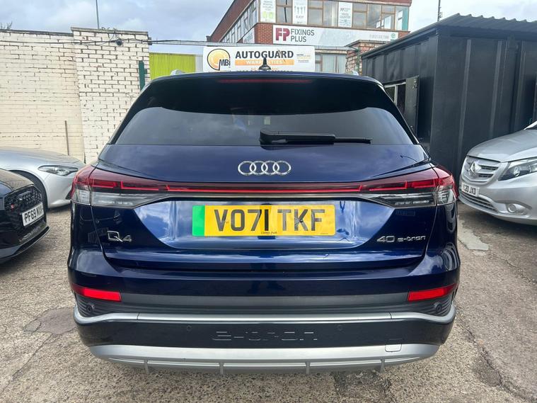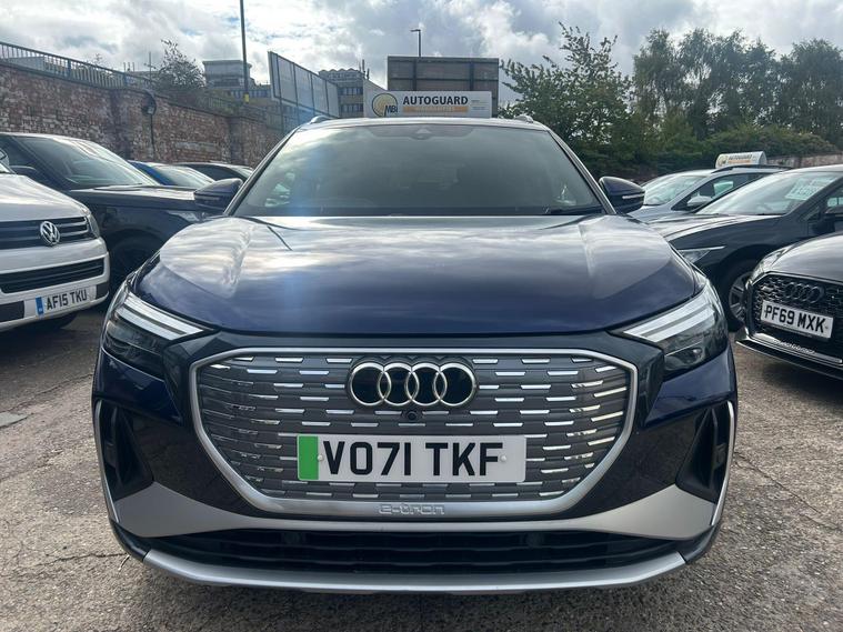 This 2021 Audi Q4 e-tron S line boasts exceptionally low mileage for its age, having covered just 31, 500 miles. As a fully electric vehicle, it offers a substantial maximum range of 303 miles from new, making it ideal for both daily commutes and longer journeys. This S line model comes equipped with a generous 82 kWh battery, providing ample power and efficiency.The Q4 e-tron S line is designed for modern driving, featuring the Audi Smartphone Interface which seamlessly integrates Android Auto and Apple CarPlay. For convenience and safety, it includes rear parking sensors with parking assistance and bright LED headlights with distinctive LED daytime running lights. Stay connected with the Bluetooth interface and enjoy added comfort with heated front seats. The vehicle also offers a large boot space, providing practical storage solutions for all your needs. The impressive 303 mile range and rapid charging capabilities, reaching 80% in just 30 minutes on compatible public chargers, set this electric SUV apart from others. Home charging on a 7kW wallbox takes approximately 11 hours and 30 minutes for a full charge. On v car cat s..