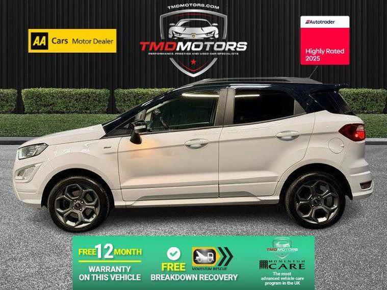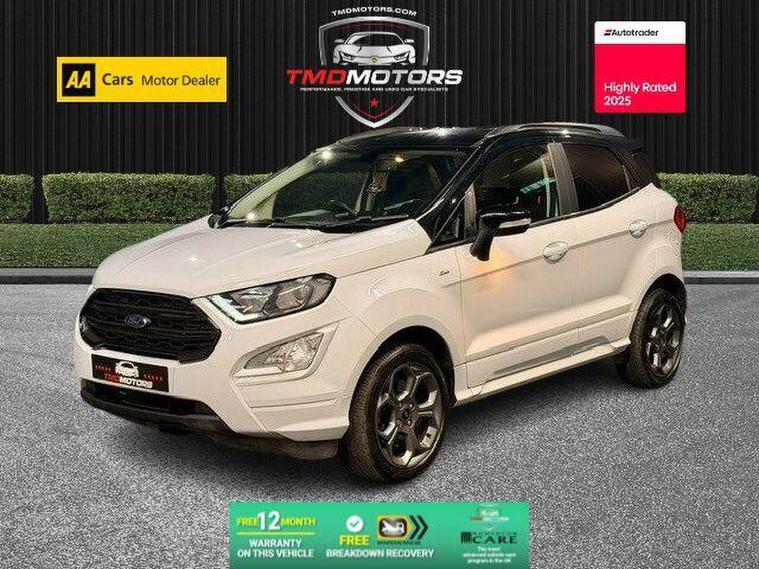 This sporty and stylish Ford EcoSport ST-Line in crisp white combines SUV practicality with ST-Line design and low running costs. With 45, 753 miles, this well-presented example offers a confident driving position, excellent fuel economy, and a premium interior — perfect for everyday use or family driving.The award-winning 1.0 EcoBoost engine delivers responsive performance while remaining economical and ULEZ friendly.? Key Details:✅ Engine: 1.0 EcoBoost Petrol – turbocharged, efficient & reliable✅ Transmission: Manual – smooth and easy to drive✅ Mileage: 45, 753 miles – well maintained✅ Colour: Clean White ? – sporty and modern finish✅ Body Style: Station Wagon / Compact SUV – versatile and practical✅ Euro 6 Compliant – fully ULEZ friendly? Added Benefits:? 12 Months Warranty – included via Momentum Warranties, the UK’s most advanced vehicle protection program? 12 Months FREE AA Breakdown Cover – total peace of mind? Machine Polished & Professionally Valeted – showroom condition inside and out ✨✅ MOT Ready – fully inspected and road-tested? ST-Line Specification Includes:? Navigation System (Mapped) with SD Card – easy and accurate route guidance? Parking Sensors – effortless parking and manoeuvring? Climate Control – perfect cabin temperature all year round? Half Leather Trim – sporty and premium interior feel? 17'' Alloy Wheels – bold ST-Line design? Privacy Glass – sleek look and rear passenger comfort? Tyre Inflation Kit – added reassurance on the road? Why Choose This Ford EcoSport ST-Line?? Sporty ST-Line Styling Inside & Out? Economical & ULEZ Compliant EcoBoost Engine? Great Spec with Navigation, Half Leather & Climate Control? Practical, Stylish & Easy to Drive SUVThis Ford EcoSport ST-Line offers the perfect balance of style, comfort, and efficiency — a fantastic compact SUV ready to drive away today.? Available now at TMD Motors – book your test drive today!? Call now – this ST-Line won’t stay available for long! ?.