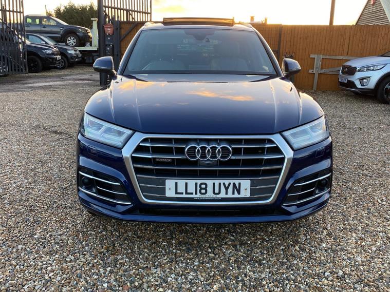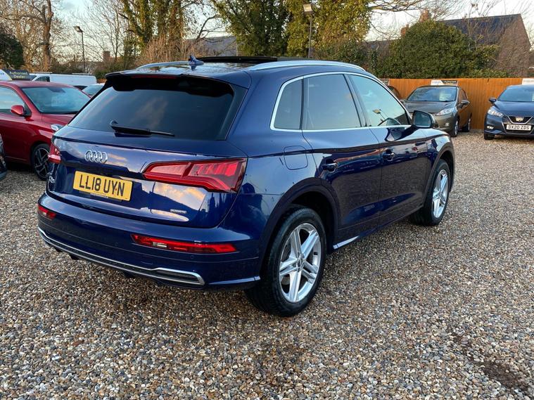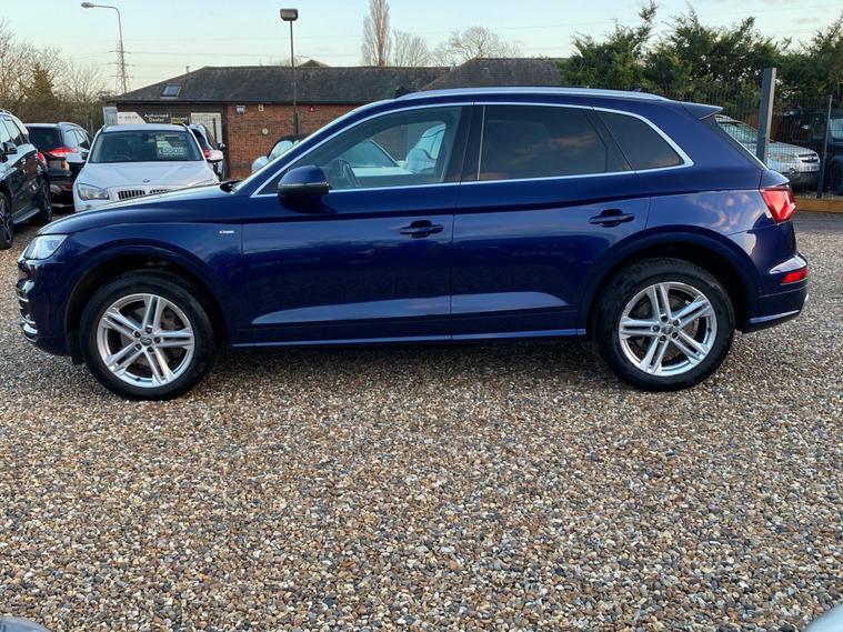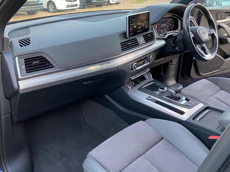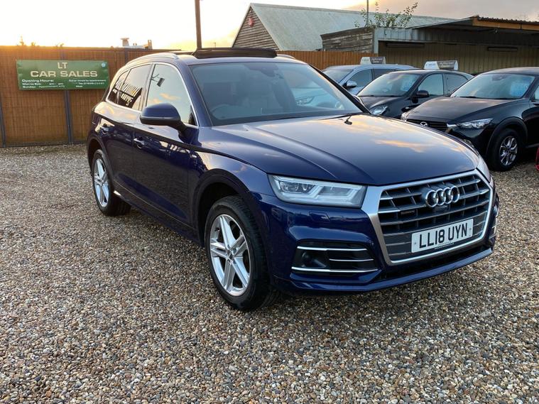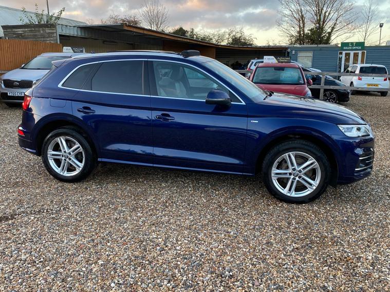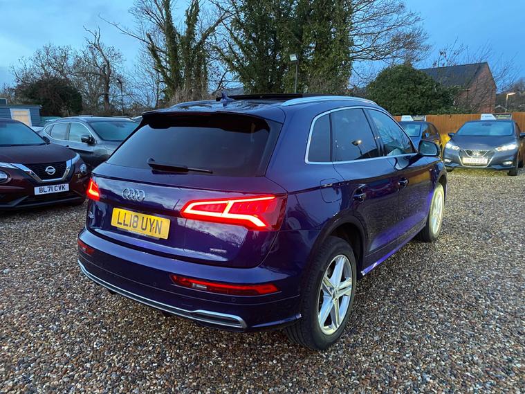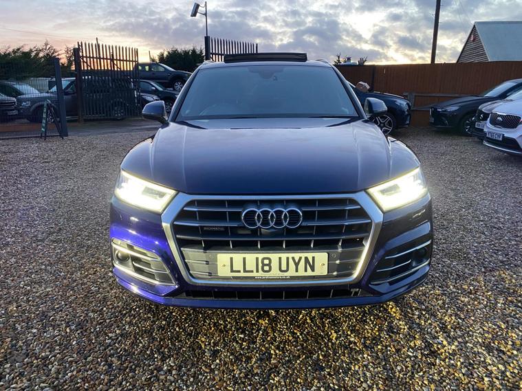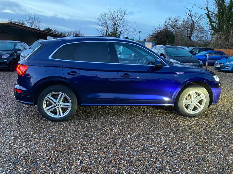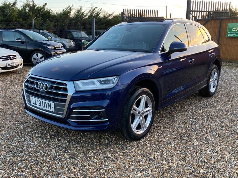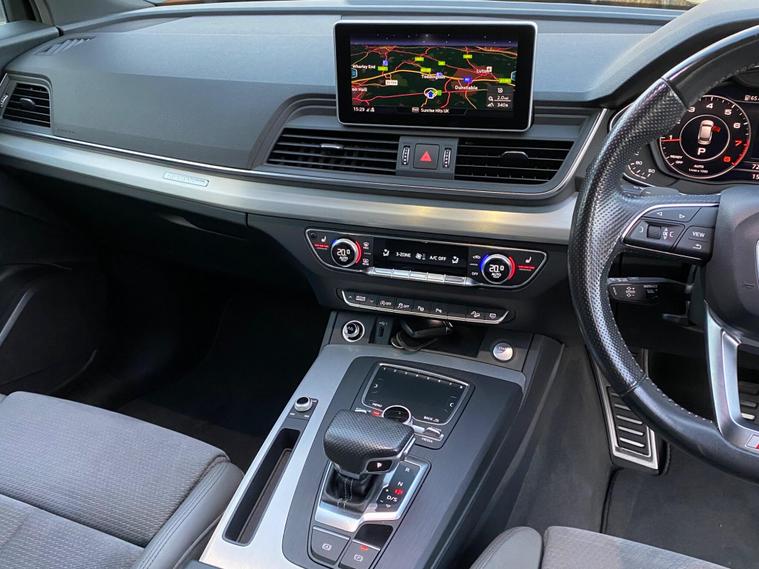 This Audi Q5 TFSI S line from 2018 boasts a clear main dealer vehicle history and has had only one owner, offering you peace of mind. Powered by a 2.0 litre petrol engine and featuring Four Wheel Drive, this Euro 6 compliant model is ready for any journey. Its S line trim ensures a premium feel, complemented by a generous boot space perfect for all your needs. You'll also appreciate the convenience of Bluetooth connectivity, automatic LED headlights with dynamic rear indicators, and the Light and Rain Sensor for effortless driving.Experience impressive performance with an acceleration of 0-62mph in just 6.3 seconds, demonstrating its dynamic capability. The Audi Parking System Plus, with front and rear sensors, makes manoeuvring simple, while the Deluxe 3-Zone Climate Control ensures comfort for everyone on board. With a substantial towing weight of 2400 kg, this Q5 is as practical as it is refined, setting it apart from other vehicles in its class..