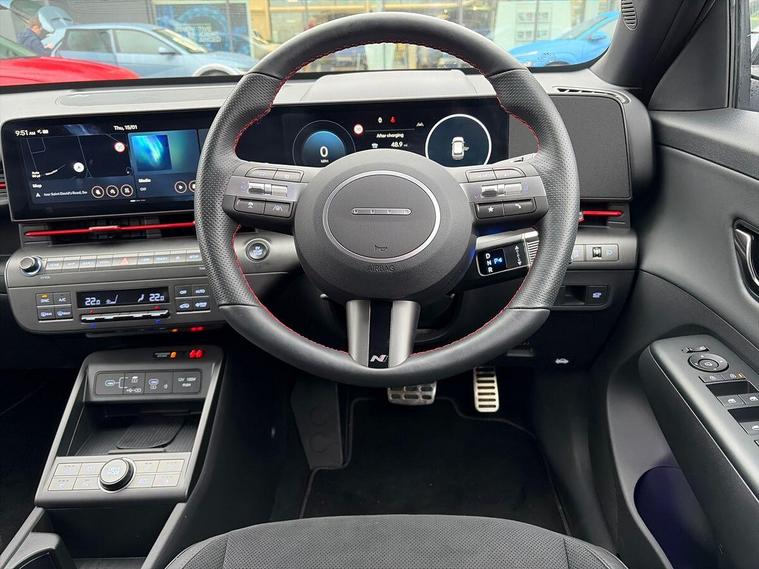 Discover the 2025 Hyundai KONA N Line S, an electric vehicle designed for modern driving. This model boasts a substantial 73 kWh battery, offering a maximum range of 282 miles when new, ensuring you can travel further on a single charge. For convenient charging, a full charge at home using a 7kW charger takes approximately 8 hours and 53 minutes. When you need a quick top up, the fastest public charging time from empty to 80% is an impressive 46 minutes.The KONA N Line S comes equipped with a suite of notable features to enhance your driving experience. Enjoy peace of mind with the rear camera and guidance system, making parking easier. Stay connected and entertained with Bluetooth connectivity and voice recognition, while the wireless phone charging pad keeps your devices powered up without the clutter of cables. For added comfort during colder months, this model includes a heated steering wheel and heated front seats. These features collectively highlight how the Hyundai KONA N Line S offers a superior and more convenient driving experience compared to other vehicles in its class..