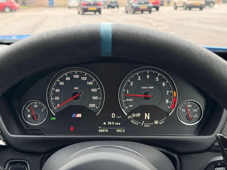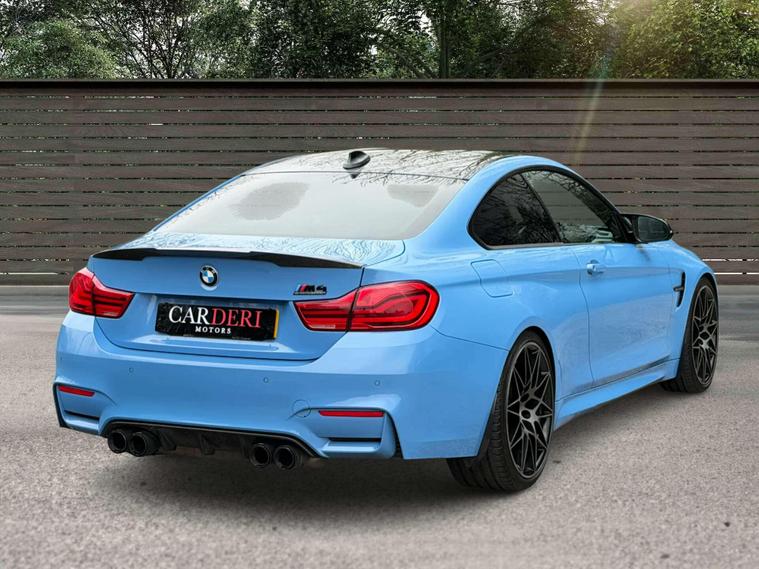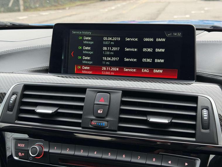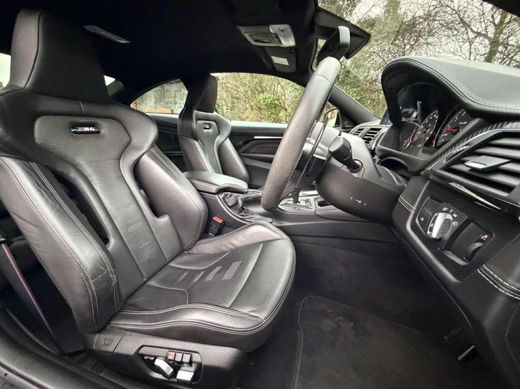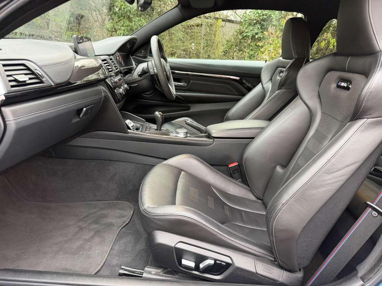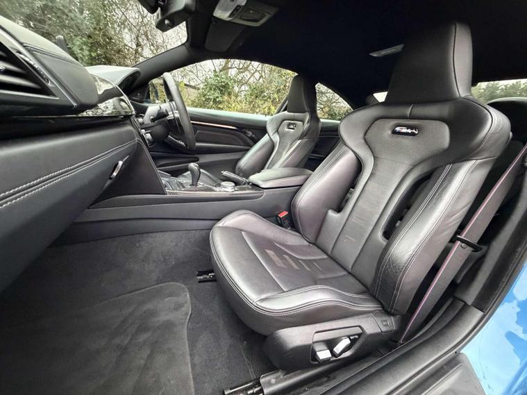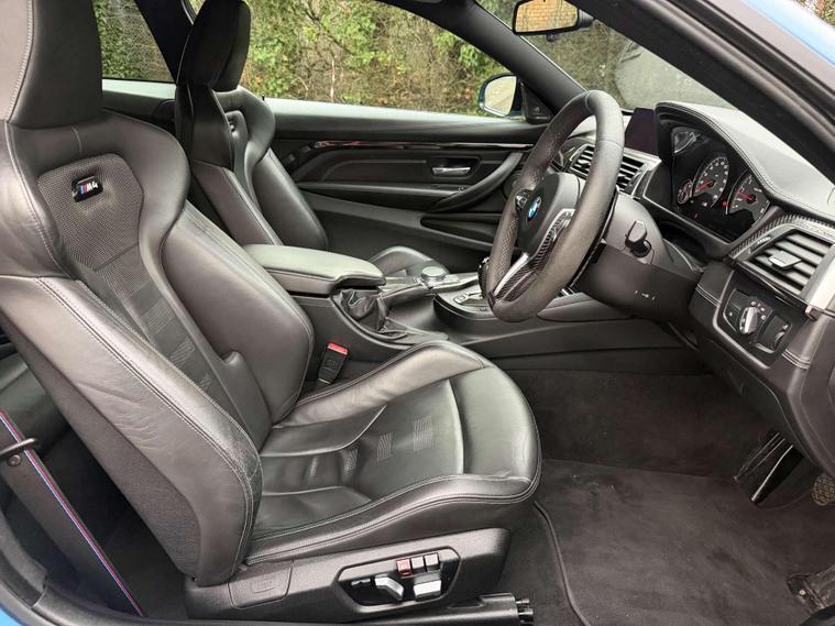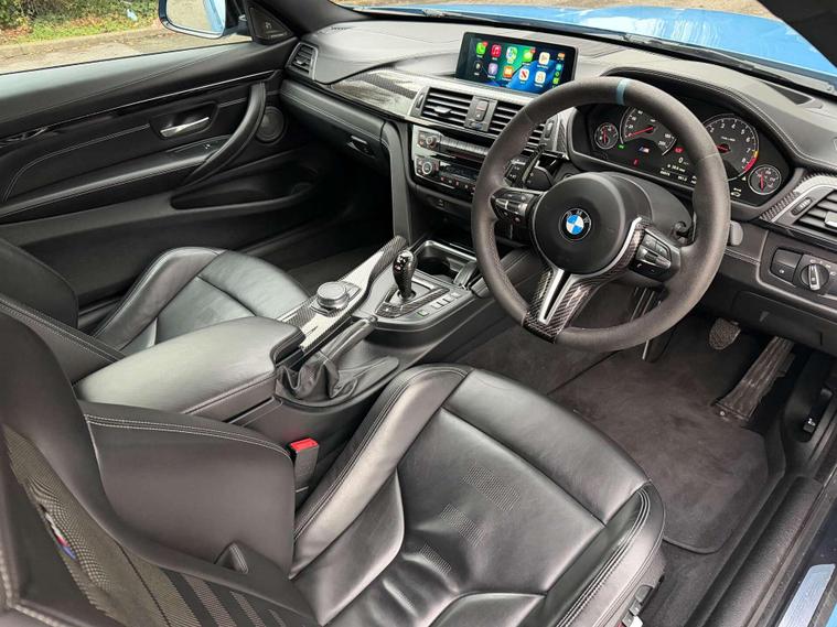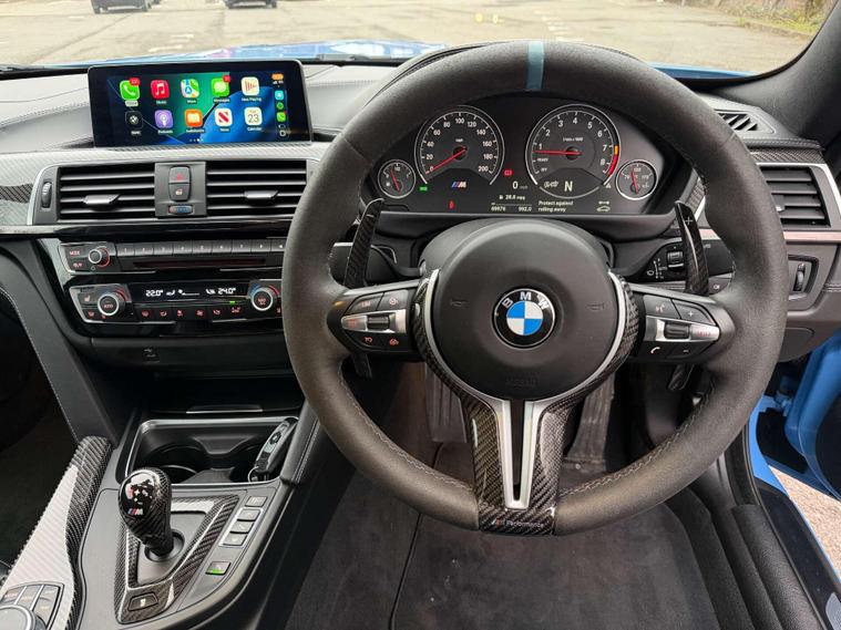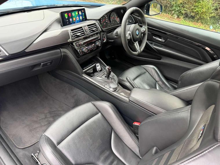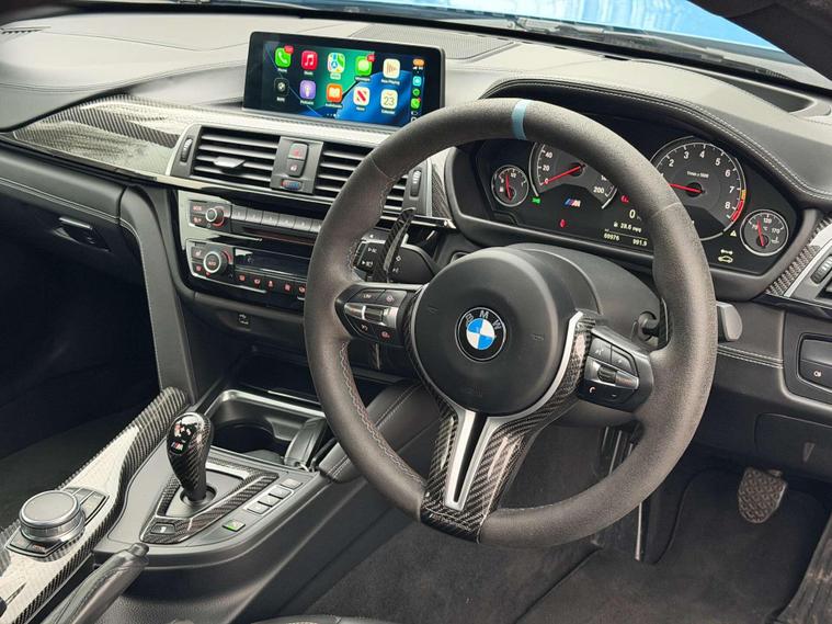 This BMW M4 Competition (F82) is presented in the iconic Yas Marina Blue, a colour that perfectly showcases the car’s aggressive lines and unmistakable M presence. A true driver’s coupe, engineered with motorsport intent and finished with a specification that leaves little to be desired.Sitting on 20” forged M Light Star-Spoke Style 666M alloy wheels in black, the stance is purposeful and planted. The exterior is elevated further by a full carbon exterior package, including carbon mirrors, giving the car a sharp, track-inspired edge while remaining unmistakably premium. Adaptive LED headlights with High-Beam Assistant provide exceptional visibility and modernise the front end.Inside, the cabin is trimmed in full Merino leather in black, paired with the carbon interior package and carbon fibre trim with black chrome finisher, creating a focused yet luxurious driving environment. Head-Up Display keeps vital information in the driver’s line of sight, while Harman Kardon surround sound delivers outstanding audio quality when cruising.Technology and usability are well covered with Apple CarPlay preparation, advanced parking package, reversing assist camera, speed limit display, sun protection glazing, and headlight wash—making this a performance car that’s just as usable day-to-day as it is thrilling when pushed.Powered by BMW M’s twin-turbo straight-six and tuned to Competition specification, this M4 delivers explosive performance, razor-sharp handling, and an engaging driving experience that defines the modern M car.A properly specified, visually striking example of the F82 M4 Competition—ready to be enjoyed by its next owner..
