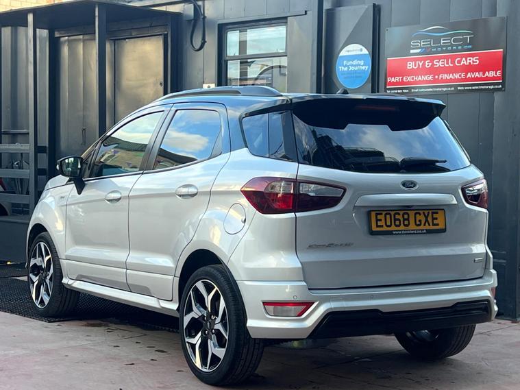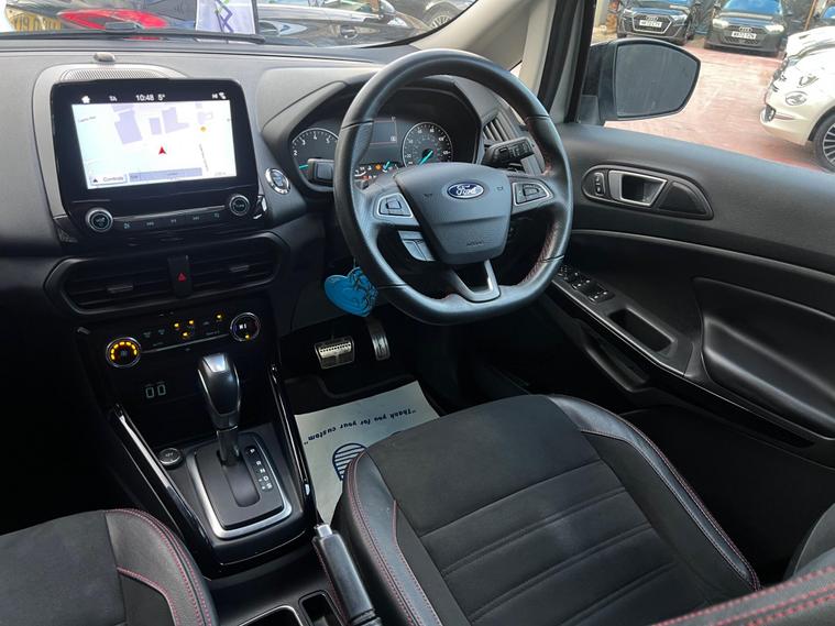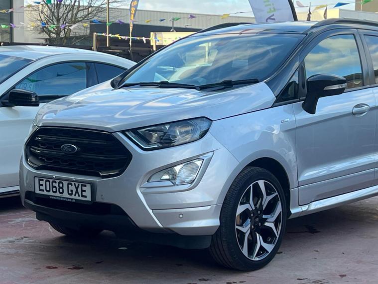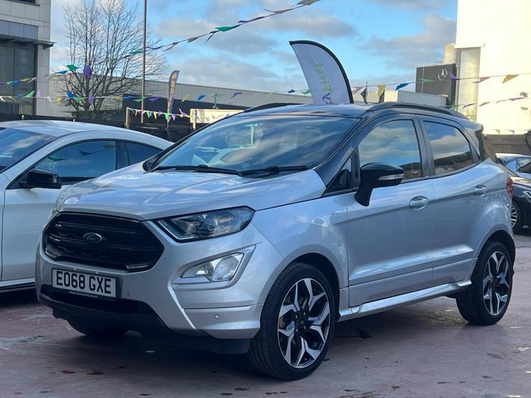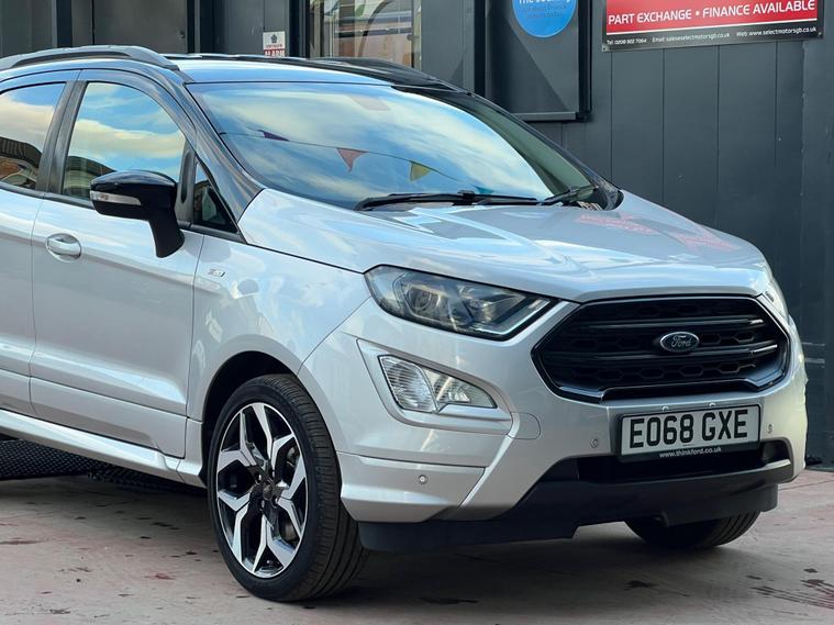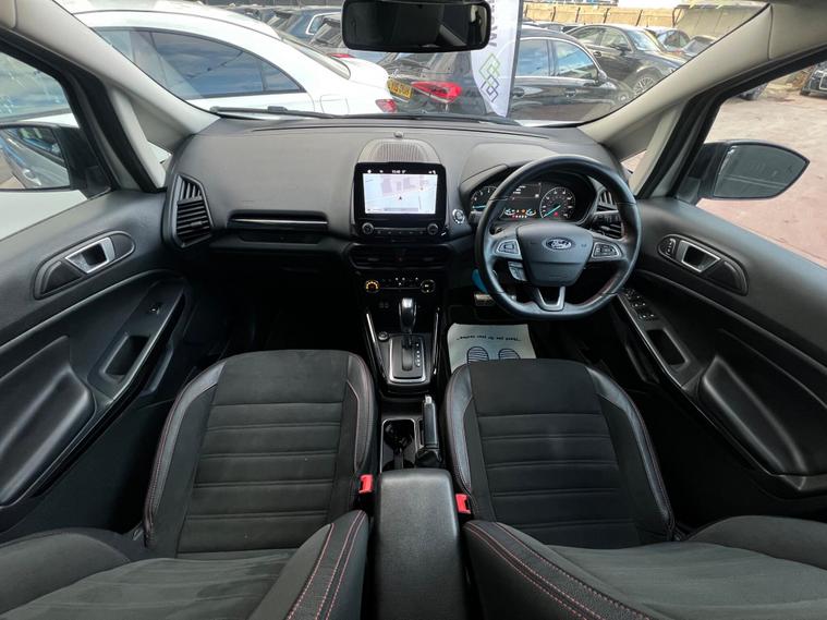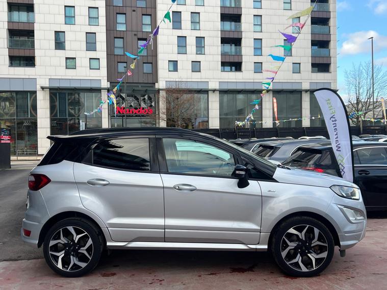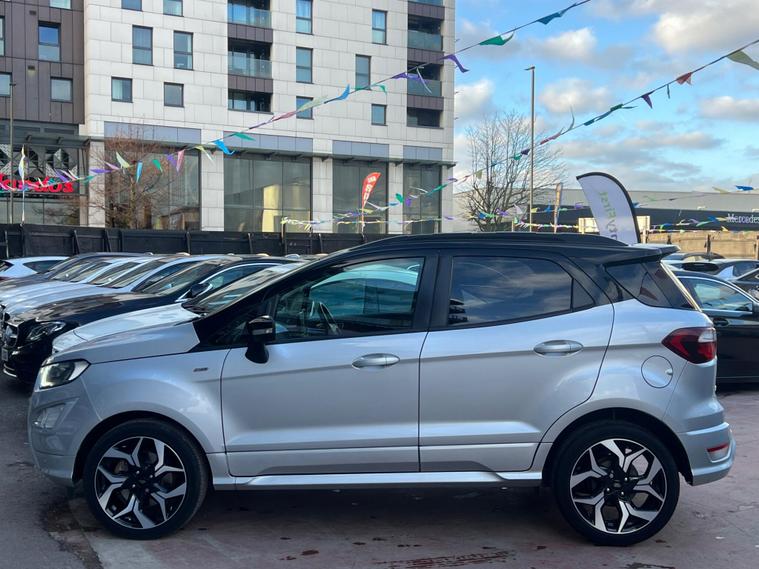 SELECT MOTORS (GB) IS DELIGHTED TO OFFER YOU THIS STUNNING FORD ECOSPORT ST-LINE 5DR IN SILVER COLOUR AND COMPLEMENTED WITH 17IN 5 SPOKE DESIGN ALLOY WHEELS. THIS VEHICLE HAS AN IMPRESSIVE SPECIFICATION WHICH INCLUDES THE FOLLOWING; SATELLITE NAVIGATION SYSTEM, CARPLAY FOR IPHONE AND ANDROID AUTOS, REVERSING CAMERA WITH SENSORS, BLUETOOTH CONNECTIVITY FOR PHONE AND MEDIA, DAB-FM/AM RADIO, ELECTRONIC AUTOMATIC TEMPERATURE AIR CONDITIONING, KEYLESS START ENGINE AND STOP PUSH BUTTON, CRUISE CONTROL WITH SPEED LIMITER, 8IN TOUCH SCREEN, ELECTRICALLY ADJUSTABLE AND FOLDING DOOR MIRRORS, TYRE PRESSURE WARNING SYSTEM. THIS VEHICLE IS ULEZ EXEMPT. WE ARE OFFERING NATIONWIDE DELIVERY ON ALL VEHICLE (PLEASE GET IN TOUCH DIRECTLY FOR DETAILS). WE CAN ALSO CONDUCT VIRTUAL VIEWINGS AND ACCOMMODATE ANY REQUESTS YOU MAY HAVE. ALL OUR ADVERTISED STOCK IS TEST-DRIVEN, INSPECTED BY OUR MECHANIC TO MAKE SURE OUR CUSTOMERS DRIVE AWAY WITH THE BEST QUALITY CARS. WE CAN PROVIDE A VIDEO WALK AROUND THIS VEHICLE UPON REQUEST., ALL OF OUR VEHICLES ARE SUPPLIED WITH A 3 MONTHS WARRANTY WITH EXTENDED OPTION. 12 MONTHS FREE AA BREAKDOWN COVER. FINANCE AVAILABLE..