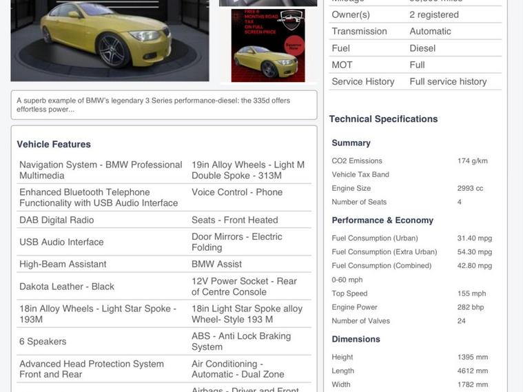 A superb example of BMW’s legendary 3 Series performance-diesel: the 335d offers effortless power, strong economy for its class and the sporty styling of the M Sport specification.3.0 litre straight-six twin-turbo diesel engine delivering ~286-313 bhp and strong torque. M Sport package includes enhanced styling (M aerodynamic body kit, M wheels), sport seats, premium trim and M badging – giving it an athletic look and feel. Combined economy figures from factory ~40+ mpg (depending on driving style) and CO₂ relatively competitive for its class. With the automatic Steptronic transmission, this car delivers refined, relaxed driving with the option to enjoy brisk perform Euro 5 emissions compliant – ideal for many areas and offering better resale prospects' when you want it. With only 2 owners and a below average mileage of 93, 500 miles for its age, this 2011 BMW 3 Series 335d M Sport presents a compelling proposition. This striking M Sport variant is powered by a robust 3.0L diesel engine, offering a blend of performance and efficiency. You can drive away with confidence, as it comes with, MOT provided on purchase, and benefits from full service history with 10 Stamps at regular interval's. Inside, you'll find a wealth of notable features designed for comfort and convenience, including enhanced Bluetooth telephone functionality with USB audio interface, supportive sport seats in the front, and a BMW Professional Multimedia navigation system. Further enhancing the driving experience are heated front seats and electric front seat adjustment with driver memory. This BMW 3 Series stands out from similar vehicles due to its impressive acceleration, achieving 0-62mph in just 5.9 seconds, a testament to its powerful engine. Furthermore, its placement in a low insurance group makes it an economical choice for many drivers. Why Buy from JDM Trading Ltd??Award-Winning Customer Service (2020-2025) with Over 285 5-Star Reviews? Specialists in Quality Used & Japanese Import Vehicles? All Debit & Credit Cards Accepted? Delivery Available Anywhere in the UK Mainland..